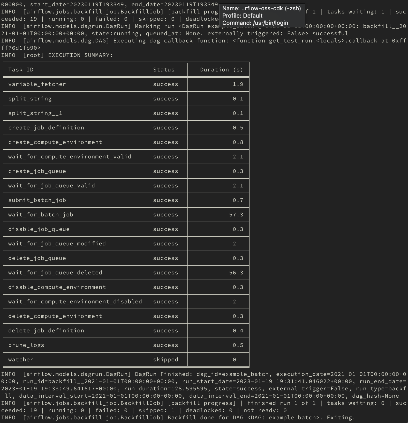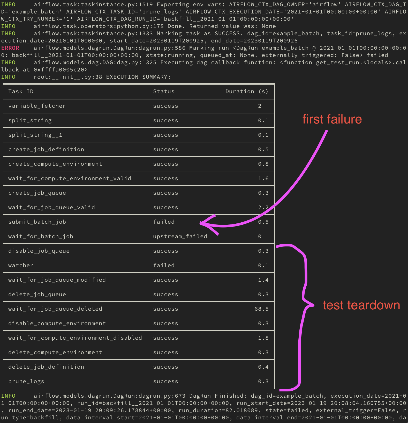 In my experience, it's currently hard to see exactly what error caused an example dag/system test to fail, because it doesn't stop right away, and teardown tasks can error as well, so it becomes an adventure up the logs to find the source of the problem. To help with that, I propose adding a summary of the run at the end of the execution with the status of the tasks. it looks like this (in this case I ran the example_batch from aws system tests):  and in case of failure:  I'm hooking myself to the dag callback to do this, and pulling the info from the tasks. I added a little duration summary as well as a freebie. It's going to be run at the end of every system test, so I guess it could be nice to get a review from some other providers who run their system tests as well :) -- This is an automated message from the Apache Git Service. To respond to the message, please log on to GitHub and use the URL above to go to the specific comment. To unsubscribe, e-mail: [email protected] For queries about this service, please contact Infrastructure at: [email protected]