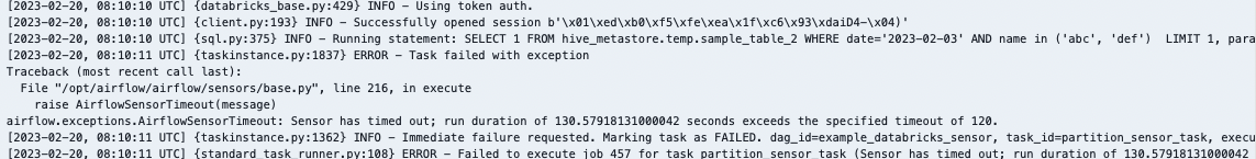 ########## airflow/providers/databricks/sensors/databricks_sql.py: ########## @@ -0,0 +1,136 @@ +# +# Licensed to the Apache Software Foundation (ASF) under one +# or more contributor license agreements. See the NOTICE file +# distributed with this work for additional information +# regarding copyright ownership. The ASF licenses this file +# to you under the Apache License, Version 2.0 (the +# "License"); you may not use this file except in compliance +# with the License. You may obtain a copy of the License at +# +# http://www.apache.org/licenses/LICENSE-2.0 +# +# Unless required by applicable law or agreed to in writing, +# software distributed under the License is distributed on an +# "AS IS" BASIS, WITHOUT WARRANTIES OR CONDITIONS OF ANY +# KIND, either express or implied. See the License for the +# specific language governing permissions and limitations +# under the License. +# +"""This module contains Databricks sensors.""" + +from __future__ import annotations + +from typing import Any, Callable, Sequence + +from airflow.exceptions import AirflowException +from airflow.providers.common.sql.hooks.sql import fetch_all_handler +from airflow.providers.databricks.hooks.databricks_sql import DatabricksSqlHook +from airflow.sensors.base import BaseSensorOperator +from airflow.utils.context import Context + + +class DatabricksSqlSensor(BaseSensorOperator): + """Generic SQL sensor for Databricks + + :param databricks_conn_id: connection id from Airflow to databricks, + defaults to DatabricksSqlHook.default_conn_name + :param http_path: Optional string specifying HTTP path of + Databricks SQL Endpoint or cluster.If not specified, it should be either specified + in the Databricks connection's extra parameters, or ``sql_endpoint_name`` must be specified. + :param sql_endpoint_name: Optional name of Databricks SQL Endpoint. + If not specified, ``http_path`` must be provided as described above. + :param session_configuration: An optional dictionary of Spark session parameters. + Defaults to None. If not specified, it could be specified in the + Databricks connection's extra parameters. + :param http_headers: An optional list of (k, v) pairs that will be set as HTTP headers on every request. + :param client_parameters: Additional parameters internal to Databricks SQL Connector parameters. + :param sql: SQL query to be executed. + :param catalog: Database name/catalog name, defaults to "hive_metastore" + :param schema: Schema name, defaults to "default" + :param handler: The result handler which is called with the result of each statement. + """ + + template_fields: Sequence[str] = ( + "databricks_conn_id", + "sql", + "catalog", + "schema", + "http_headers", + ) + + template_ext: Sequence[str] = (".sql",) + template_fields_renderers = {"sql": "sql"} + + def __init__( + self, + *, + databricks_conn_id: str = DatabricksSqlHook.default_conn_name, + http_path: str | None = None, + sql_endpoint_name: str | None = None, + session_configuration=None, + http_headers: list[tuple[str, str]] | None = None, + catalog: str = "hive_metastore", + schema: str = "default", + sql: str | None = None, + handler: Callable[[Any], Any] = fetch_all_handler, + client_parameters: dict[str, Any] | None = None, + **kwargs, + ) -> None: + """_summary_ + + :param databricks_conn_id: _description_, defaults to DatabricksSqlHook.default_conn_name + :param http_path: _description_, defaults to None + :param sql_endpoint_name: _description_, defaults to None + :param session_configuration: _description_, defaults to None + :param http_headers: _description_, defaults to None + :param catalog: _description_, defaults to "hive_metastore" + :param schema: _description_, defaults to "default" + :param sql: _description_, defaults to None + :param handler: _description_, defaults to fetch_all_handler + :param client_parameters: _description_, defaults to None + """ + super().__init__(**kwargs) + self.databricks_conn_id = databricks_conn_id + self._http_path = http_path + self._sql_endpoint_name = sql_endpoint_name + self.session_config = session_configuration + self.http_headers = http_headers + self.catalog = catalog + self.schema = schema + self.sql = sql + self.caller = "DatabricksSqlSensor" + self.client_parameters = client_parameters or {} + self.hook_params = kwargs.pop("hook_params", {}) + self.handler = handler + + def _get_hook(self) -> DatabricksSqlHook: + return DatabricksSqlHook( + self.databricks_conn_id, + self._http_path, + self._sql_endpoint_name, + self.session_config, + self.http_headers, + self.catalog, + self.schema, + self.caller, + **self.client_parameters, + **self.hook_params, + ) + + def _sql_sensor(self, sql): + hook = self._get_hook() + sql_result = hook.run( + sql, + handler=self.handler if self.do_xcom_push else None, + ) + return sql_result + + def _get_results(self) -> bool: + result = self._sql_sensor(self.sql) + self.log.debug("SQL result: %s", result) + if len(result) < 1: + raise AirflowException("No results for SQL sensor.") Review Comment: Ah yes, I was actually testing it out and wanted to send the screenshot to you :)  -- This is an automated message from the Apache Git Service. To respond to the message, please log on to GitHub and use the URL above to go to the specific comment. To unsubscribe, e-mail: [email protected] For queries about this service, please contact Infrastructure at: [email protected]