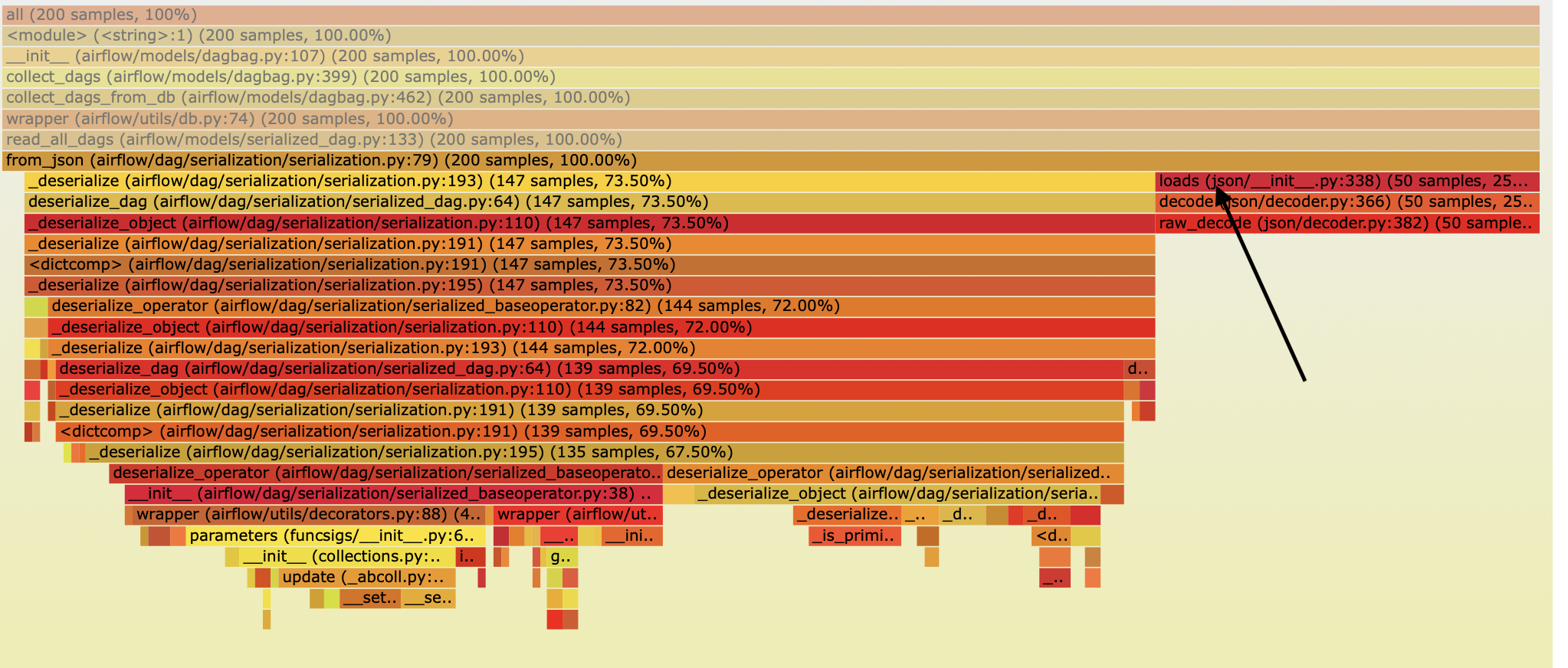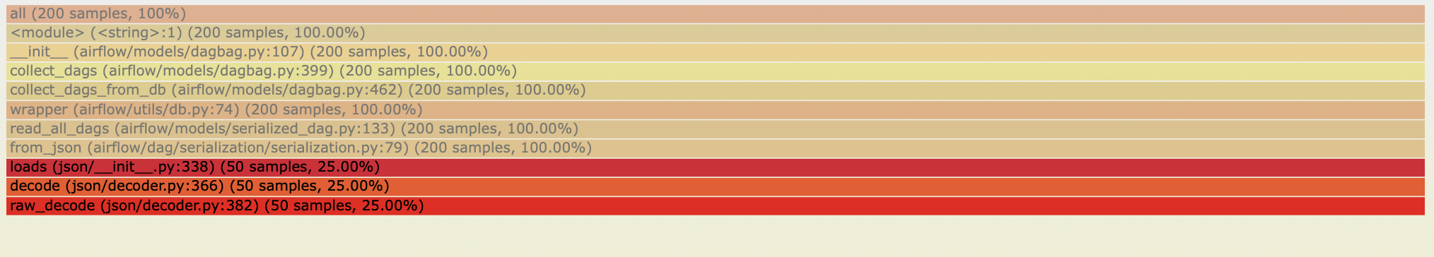 kaxil edited a comment on issue #5743: [AIRFLOW-5088][AIP-24] Persisting serialized DAG in DB for webserver scalability URL: https://github.com/apache/airflow/pull/5743#issuecomment-528654768 Some more benchmarking:  As you can fetching DAGs from DB is still taking more time than parsing DAGs from files. The flame graphs below show that a good amount of time is spent in loading the json (`json.loads`) into a Python dictionary.   So we have 2 solutions: (1) Replace `json` package with a faster json-parsing package. Many online benchmark showed that the `json` package is relatively slow. Based on that I carried out benchmarks of few popular json packages for our use-case: ``` import json import yajl import ujson In [21]: %timeit -n100 json.loads(testLoad74_w_json) 100 loops, best of 3: 25.5 ms per loop In [20]: %timeit -n100 yajl.loads(testLoad74_w_json) 100 loops, best of 3: 11.2 ms per loop In [22]: %timeit -n100 ujson.loads(testLoad74_w_json) 100 loops, best of 3: 9.67 ms per loop ``` Based on the above results I will change `json.loads` to `ujson.loads` and bechmark again. Will post the results tomorrow. (2) Reduce the number of fields that we store in DB even further. The current size of 1 of our test Serialized DAG is ~1.95 mb
