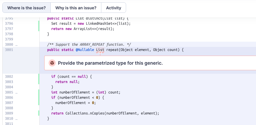 > Can we declare the type of the element?  > > For example, `List<Object>`  > > Here is code smells link: https://sonarcloud.io/project/issues?resolved=false&types=CODE_SMELL&pullRequest=3198&id=apache_calcite&open=AYgY9shmOpxb3UapS_aX fixed, Thank you for your very detailed code review. @JiajunBernoulli -- This is an automated message from the Apache Git Service. To respond to the message, please log on to GitHub and use the URL above to go to the specific comment. To unsubscribe, e-mail: [email protected] For queries about this service, please contact Infrastructure at: [email protected]