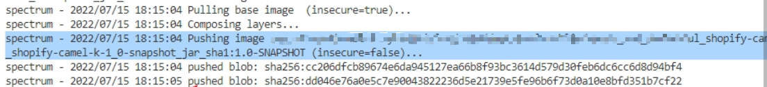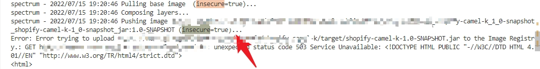 Hi Community, We are running into an issue when using local dependencies option ```-d file:///path/xxx.jar``` in ```--registry-insecure false``` mode on k8s, but it still logs ```(insecure=true)``` during pushing image and throws an error of unexpected status code 503 Service Unavailable. The same task works fine without using local dependencies. **VERSION** Camel K Client 1.9.2 **Command to produce the Issue** kamel install command ``` kamel install \ --registry-insecure false \ --registry xxx.com \ --registry-auth-username xxx \ --registry-auth-password xxx \ --organization xxx \ --maven-settings=configmap:maven-settings/settings.xml \ --build-timeout 1h \ --cluster-type kubernetes \ --build-publish-strategy Spectrum \ --force \ -n xxx ``` kamel run command ``` kamel run xxx.java \ -d file:///path/shopify-camel-k-1.0-SNAPSHOT.jar \ -n xxx \ --dev ``` **Error Log** **with** local dependencies option ```-d file:///path/shopify-camel-k-1.0-SNAPSHOT.jar```  **without** local dependencies option ```-d file:///path/shopify-camel-k-1.0-SNAPSHOT.jar```  **Expected Behavior** We want use local jar dependencies ```-d file:///path/xxx.jar```and the HTTPS protocol in registry config ```--registry-insecure false``` Thanks -- This is an automated message from the Apache Git Service. To respond to the message, please log on to GitHub and use the URL above to go to the specific comment. To unsubscribe, e-mail: [email protected] For queries about this service, please contact Infrastructure at: [email protected]