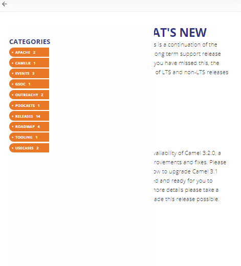 rimshach opened a new pull request #348: Display Category Tags on blog pages for small screens URL: https://github.com/apache/camel-website/pull/348 When we open the blog page from mobile, it was difficult to directly open a specific category blogs as the tags were not visible on mobile screens.This made navigation on mobile phones difficult. Now I have made the following changes : Added a burger button for category on smaller screens using the existing css classes i.e nav-container and nav-toggle.On click the side menu is opened and category tags are displayed. Now the pages looks like: