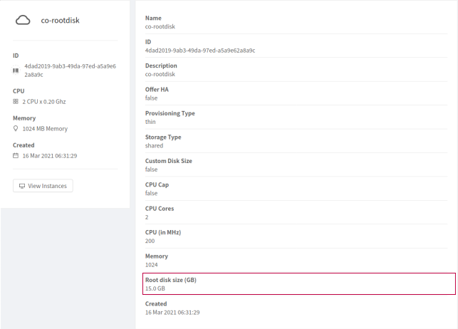 ### Description This PR displays the Root disk size as part of compute offering details if the offering was created with it specified. ### Types of changes - [ ] Breaking change (fix or feature that would cause existing functionality to change) - [ ] New feature (non-breaking change which adds functionality) - [X] Bug fix (non-breaking change which fixes an issue) - [ ] Enhancement (improves an existing feature and functionality) - [ ] Cleanup (Code refactoring and cleanup, that may add test cases) ### Feature/Enhancement Scale or Bug Severity #### Bug Severity - [ ] BLOCKER - [ ] Critical - [ ] Major - [X] Minor - [ ] Trivial ### How Has This Been Tested? Prior to this fix: When a compute offering is created with root disk size specified, there is not indication of this attribute in the corresponding Compute offering's details. Post fix:  <!-- Please read the [CONTRIBUTING](https://github.com/apache/cloudstack/blob/master/CONTRIBUTING.md) document --> -- This is an automated message from the Apache Git Service. To respond to the message, please log on to GitHub and use the URL above to go to the specific comment. For queries about this service, please contact Infrastructure at: [email protected]