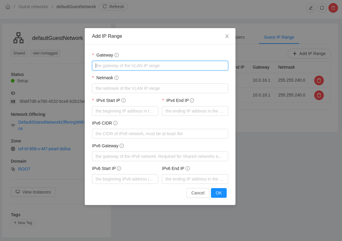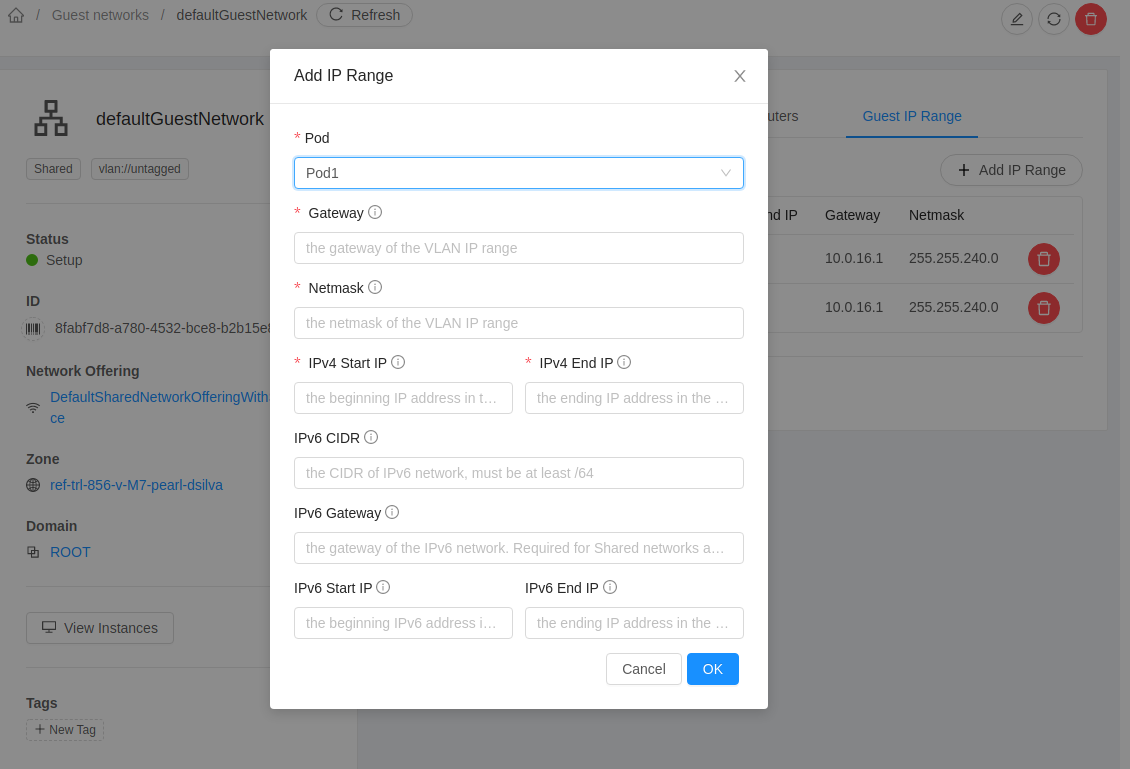 ### Description While add IP range for a basic zone, podid parameter must be passed with createVlanIpRange. <!--- Describe your changes in DETAIL - And how has behaviour functionally changed. --> <!-- For new features, provide link to FS, dev ML discussion etc. --> <!-- In case of bug fix, the expected and actual behaviours, steps to reproduce. --> <!-- When "Fixes: #<id>" is specified, the issue/PR will automatically be closed when this PR gets merged --> <!-- For addressing multiple issues/PRs, use multiple "Fixes: #<id>" --> <!-- Fixes: # --> <!--- ********************************************************************************* --> <!--- NOTE: AUTOMATATION USES THE DESCRIPTIONS TO SET LABELS AND PRODUCE DOCUMENTATION. --> <!--- PLEASE PUT AN 'X' in only **ONE** box --> <!--- ********************************************************************************* --> ### Types of changes - [ ] Breaking change (fix or feature that would cause existing functionality to change) - [ ] New feature (non-breaking change which adds functionality) - [x] Bug fix (non-breaking change which fixes an issue) - [ ] Enhancement (improves an existing feature and functionality) - [ ] Cleanup (Code refactoring and cleanup, that may add test cases) ### Feature/Enhancement Scale or Bug Severity #### Feature/Enhancement Scale - [ ] Major - [ ] Minor #### Bug Severity - [ ] BLOCKER - [ ] Critical - [ ] Major - [x] Minor - [ ] Trivial ### Screenshots (if appropriate): ### How Has This Been Tested? <!-- Please describe in detail how you tested your changes. --> <!-- Include details of your testing environment, and the tests you ran to --> <!-- see how your change affects other areas of the code, etc. --> <!-- Please read the [CONTRIBUTING](https://github.com/apache/cloudstack/blob/master/CONTRIBUTING.md) document --> In legacy UI:  W/o change in UI:  After change in UI:  -- This is an automated message from the Apache Git Service. To respond to the message, please log on to GitHub and use the URL above to go to the specific comment. For queries about this service, please contact Infrastructure at: [email protected]