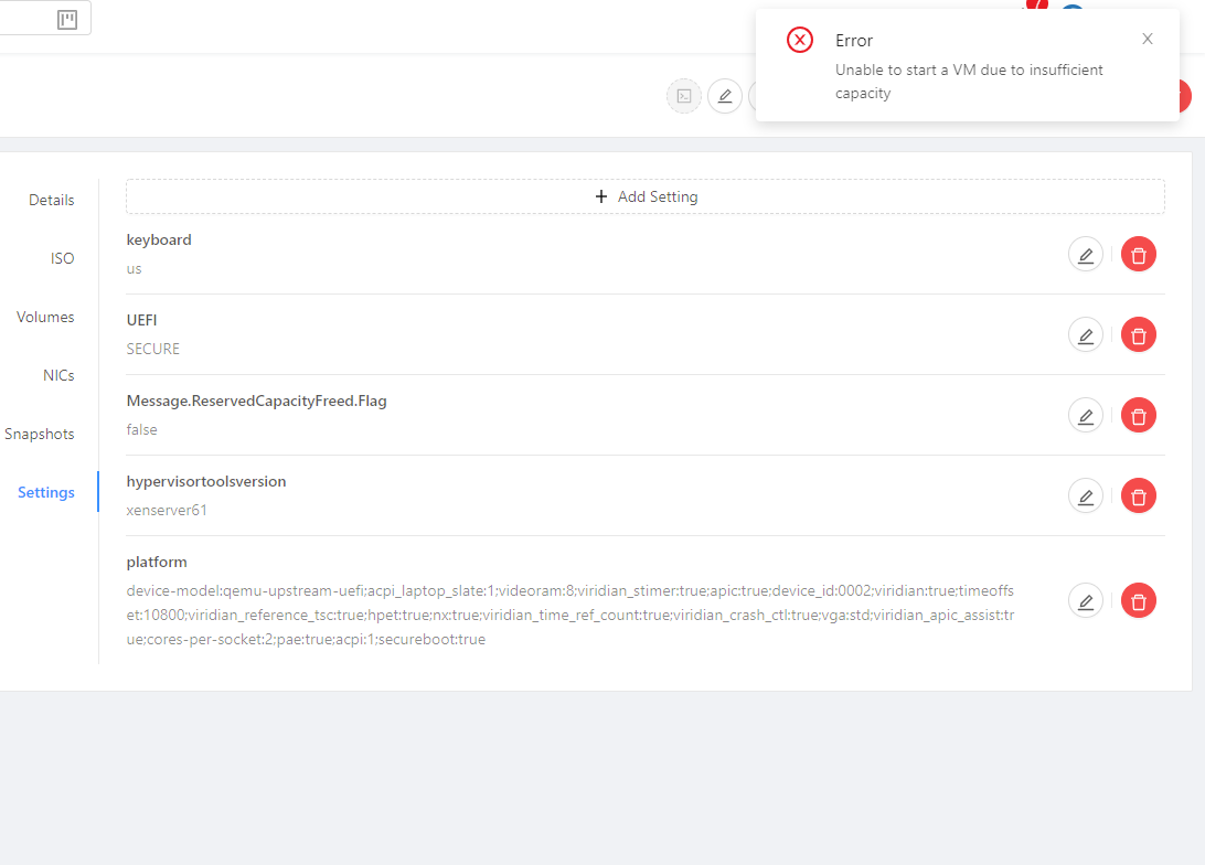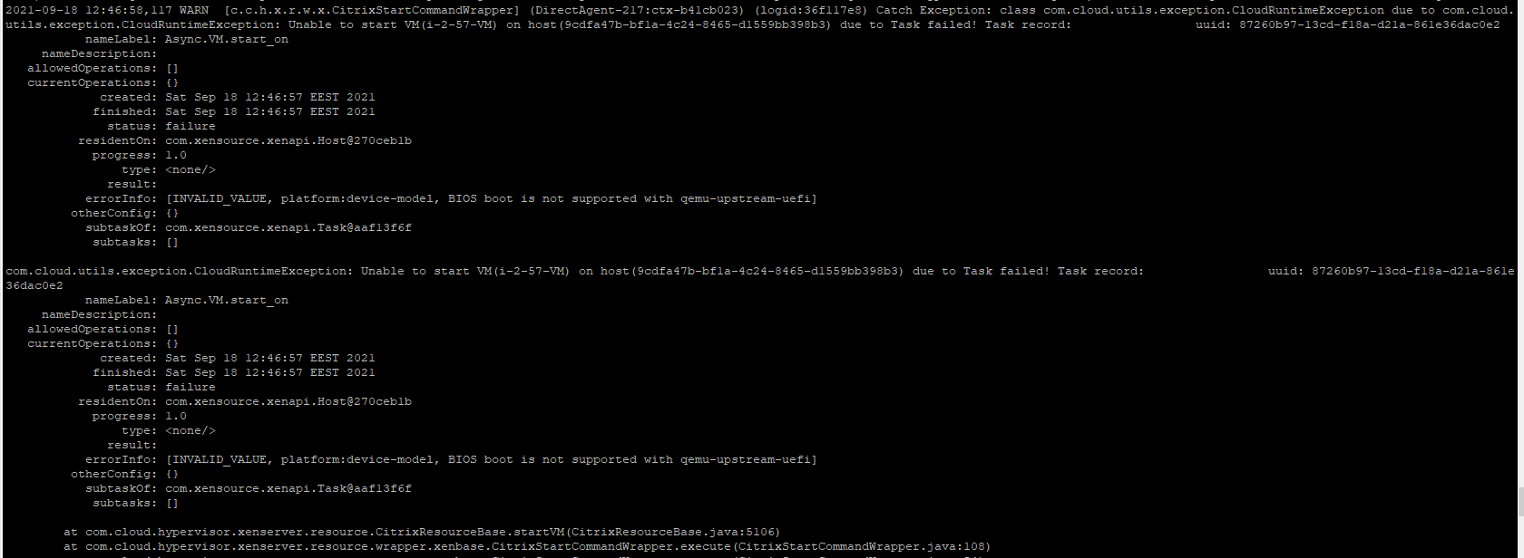 > Cloudstack 4.15.2 is now capable to handle Xenserver/XCP-NG versions that support UEFI, but if the template was made with 4.15.1 I guess that the key/value pair related to boottype couldn't be declared to VM details. > @AlexanderKgr Did you try to create a windows template with UEFI option using the 4.15.2? made today a new instance with iso from the scratch. Everything worked. When i shutdown the instance and tried to boot it, without even touching the settings... Again the same issue!  and from the logs  seems that every instance is trying to boot with boot but has options for uefi. this is critical i think @rhtyd @DaanHoogland @shwstppr @nvazquez -- This is an automated message from the Apache Git Service. To respond to the message, please log on to GitHub and use the URL above to go to the specific comment. To unsubscribe, e-mail: [email protected] For queries about this service, please contact Infrastructure at: [email protected]