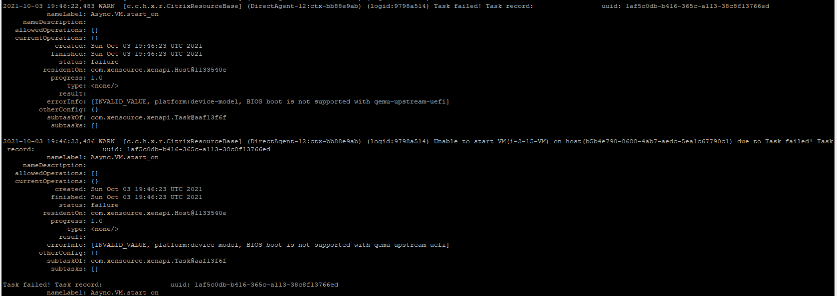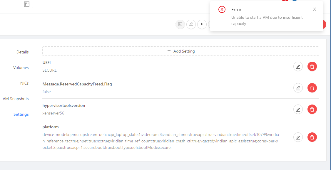 > Go to existing VM, and in stop stopped state you should be able to add/edit in the VM details or properties tab. added boottype and boot mode ad vm settings and the same happened   and the startcommand 2021-10-03 19:46:21,420 DEBUG [c.c.a.t.Request] (Work-Job-Executor-6:ctx-47ef3214 job-250/job-253 ctx-ece0542f) (logid:9798a514) Seq 1-2257147838242750495: Executing: { Cmd , MgmtId: 52227725262, via: 1(xcp1), Ver: v1, Flags: 100011, [{"com.cloud.agent.api.StartCommand":{"vm":{"id":"15","name":"i-2-15-VM","bootloader":"PyGrub","state":"Starting","type":"User","cpus":"2","minSpeed":"1500","maxSpeed":"1500","minRam":"(2.00 GB) 2147483648","maxRam":"(2.00 GB) 2147483648","arch":"x86_64","os":"Windows 10 (64-bit)","platformEmulator":"Windows 10 (64-bit)","bootArgs":"","enableHA":"false","limitCpuUse":"false","enableDynamicallyScaleVm":"false","vncPassword":"CcecDXH0bEJPSqdEj5jJoQ","params":{"hypervisortoolsversion":"xenserver56","UEFI":"SECURE","platform":"device-model:qemu-upstream-uefi;acpi_laptop_slate:1;videoram:8;viridian_stimer:true;apic:true;viridian:true;timeoffset:10799;viridian_reference_tsc:true;hpet:true;nx:true;viridian_time_ref_count:true;viridian_crash_ctl:true;vga:std ;viridian_apic_assist:true;cores-per-socket:2;pae:true;acpi:1;secureboot:true;bootType:uefi;bootMode:secure;","Message.ReservedCapacityFreed.Flag":"false"},"uuid":"8b9a126c-1f11-4838-bae6-70f337d5c192","enterHardwareSetup":"false","disks":[{"data":{"org.apache.cloudstack.storage.to.VolumeObjectTO":{"uuid":"01d92436-558c-4193-83e6-3679b3c62e24","volumeType":"ROOT","dataStore":{"org.apache.cloudstack.storage.to.PrimaryDataStoreTO":{"uuid":"45f7e441-1140-327a-8b65-445355ea8f22","id":"1","poolType":"NetworkFilesystem","host":"10.0.100.15","path":"/mnt/Pool/primary","port":"2049","url":"NetworkFilesystem://10.0.100.15/mnt/Pool/primary/?ROLE=Primary&STOREUUID=45f7e441-1140-327a-8b65-445355ea8f22","isManaged":"false"}},"name":"ROOT-15","size":"(25.00 GB) 26843545600","path":"961cd170-e4ba-41c7-bbcc-5a4f431be036","volumeId":"15","vmName":"i-2-15-VM","accountId":"2","format":"VHD","provisioningType":"THIN","id":"15","deviceId":"0","bytesReadRate":"(0 bytes) 0","bytesWriteRate":"(0 bytes) 0", "iopsReadRate":"(0 bytes) 0","iopsWriteRate":"(0 bytes) 0","cacheMode":"NONE","hypervisorType":"XenServer","directDownload":"false","deployAsIs":"false"}},"diskSeq":"0","path":"961cd170-e4ba-41c7-bbcc-5a4f431be036","type":"ROOT","_details":{"storageHost":"10.0.100.15","managed":"false","storagePort":"2049","volumeSize":"(25.00 GB) 26843545600"}},{"data":{"org.apache.cloudstack.storage.to.TemplateObjectTO":{"id":"0","format":"ISO","accountId":"0","hvm":"false","bootable":"false","directDownload":"false","deployAsIs":"false"}},"diskSeq":"3","type":"ISO"}],"nics":[{"deviceId":"0","networkRateMbps":"200","defaultNic":"true","pxeDisable":"false","nicUuid":"5bda150c-3c2a-48e1-8214-a98307dcb38d","details":{"PromiscuousMode":"false","ForgedTransmits":"true","MacAddressChanges":"true"},"dpdkEnabled":"false","uuid":"5443bcc5-ba80-4cba-b97e-5d6018d3f31a","ip":"192.168.105.115","netmask":"255.255.255.0","gateway":"192.168.105.1","mac":"1e:00:4d:00:02:58","dns1":"1.1.1.1","broadcastType":"Vlan", "type":"Guest","broadcastUri":"vlan://0","isolationUri":"vlan://0","isSecurityGroupEnabled":"false","name":"GUEST"}],"vcpuMaxLimit":"1","guestOsDetails":{},"extraConfig":{}},"hostIp":"192.168.98.41","executeInSequence":"false","wait":"0","bypassHostMaintenance":"false"}}] } Still there is this line  and i am uploading the log capture before i boot the vm until the error [log.txt](https://github.com/apache/cloudstack/files/7274455/log.txt) -- This is an automated message from the Apache Git Service. To respond to the message, please log on to GitHub and use the URL above to go to the specific comment. To unsubscribe, e-mail: [email protected] For queries about this service, please contact Infrastructure at: [email protected]