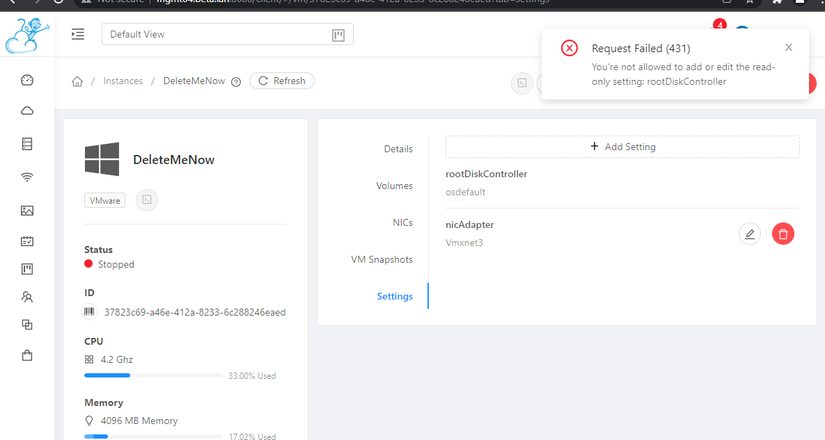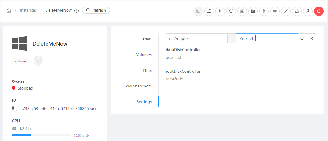 @shwstppr Step by step how to reproduce it. 1. Install Windows Server from ISO 2. Hypervisor is Vmware 3. Install VMware Tools on VM 4. Reboot 5. By default in VMware nic adapter is E1000 6. Shutdown VM 7. Try change nic adapter to VMxnet3, get and get error in new UI 8. Try change nic adapter to VMxnet3 in old UI and its working.      -- This is an automated message from the Apache Git Service. To respond to the message, please log on to GitHub and use the URL above to go to the specific comment. To unsubscribe, e-mail: [email protected] For queries about this service, please contact Infrastructure at: [email protected]