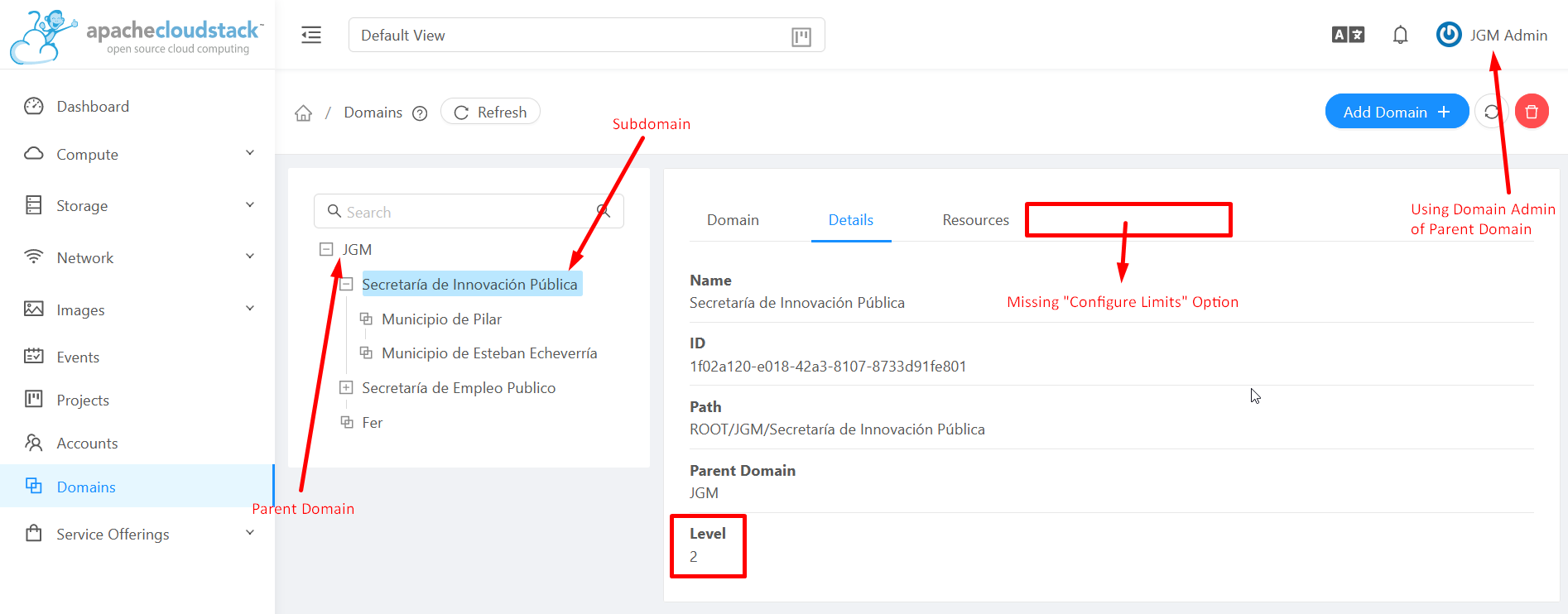 subdomains (using the domain admin user of the parent domain) works correctly.