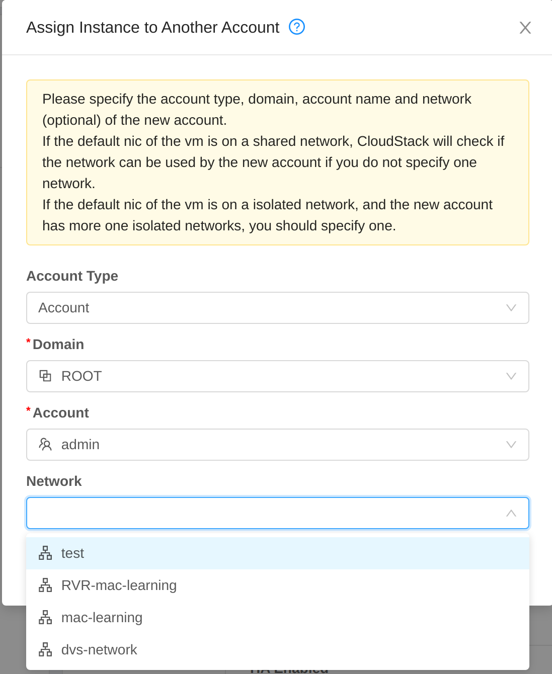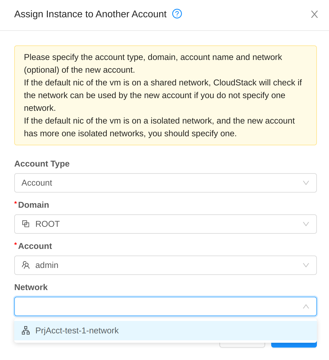 ### Description This PR fixes the issue that the network list when assign vm to other accounts in project view the issue is found when tested the feature for #5248 new UI  old /wrong UI  <!--- Describe your changes in DETAIL - And how has behaviour functionally changed. --> <!-- For new features, provide link to FS, dev ML discussion etc. --> <!-- In case of bug fix, the expected and actual behaviours, steps to reproduce. --> <!-- When "Fixes: #<id>" is specified, the issue/PR will automatically be closed when this PR gets merged --> <!-- For addressing multiple issues/PRs, use multiple "Fixes: #<id>" --> <!-- Fixes: # --> <!--- ********************************************************************************* --> <!--- NOTE: AUTOMATATION USES THE DESCRIPTIONS TO SET LABELS AND PRODUCE DOCUMENTATION. --> <!--- PLEASE PUT AN 'X' in only **ONE** box --> <!--- ********************************************************************************* --> ### Types of changes - [ ] Breaking change (fix or feature that would cause existing functionality to change) - [ ] New feature (non-breaking change which adds functionality) - [x] Bug fix (non-breaking change which fixes an issue) - [ ] Enhancement (improves an existing feature and functionality) - [ ] Cleanup (Code refactoring and cleanup, that may add test cases) ### Feature/Enhancement Scale or Bug Severity #### Feature/Enhancement Scale - [ ] Major - [ ] Minor #### Bug Severity - [ ] BLOCKER - [ ] Critical - [ ] Major - [x] Minor - [ ] Trivial ### Screenshots (if appropriate): ### How Has This Been Tested? <!-- Please describe in detail how you tested your changes. --> <!-- Include details of your testing environment, and the tests you ran to --> <!-- see how your change affects other areas of the code, etc. --> <!-- Please read the [CONTRIBUTING](https://github.com/apache/cloudstack/blob/main/CONTRIBUTING.md) document --> -- This is an automated message from the Apache Git Service. To respond to the message, please log on to GitHub and use the URL above to go to the specific comment. To unsubscribe, e-mail: [email protected] For queries about this service, please contact Infrastructure at: [email protected]