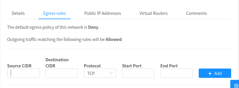 > clgtm, can you expand on testing for this @Pearl1594 @DaanHoogland Sorry for the delay in response. So to test this - 1. Create an Isolated Network offering setting the default egress policy (if firewall service is checked) - true / false 2. Create a network using that offering 3. Notice in the details tab of the created network you will find details of the policy:  4. Go to the egress rules tab, there's a note for user to understand the implication of the policy / rules they add:  cc @weizhouapache I've address your comments. Thanks for the review. -- This is an automated message from the Apache Git Service. To respond to the message, please log on to GitHub and use the URL above to go to the specific comment. To unsubscribe, e-mail: [email protected] For queries about this service, please contact Infrastructure at: [email protected]