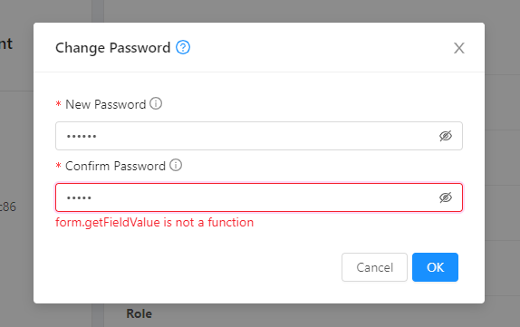 ### Description This PR fixes error form.getFieldValue is not a function in change user password form <!--- Describe your changes in DETAIL - And how has behaviour functionally changed. --> <!-- For new features, provide link to FS, dev ML discussion etc. --> <!-- In case of bug fix, the expected and actual behaviours, steps to reproduce. --> <!-- When "Fixes: #<id>" is specified, the issue/PR will automatically be closed when this PR gets merged --> <!-- For addressing multiple issues/PRs, use multiple "Fixes: #<id>" --> <!-- Fixes: # --> <!--- ********************************************************************************* --> <!--- NOTE: AUTOMATATION USES THE DESCRIPTIONS TO SET LABELS AND PRODUCE DOCUMENTATION. --> <!--- PLEASE PUT AN 'X' in only **ONE** box --> <!--- ********************************************************************************* --> ### Types of changes - [ ] Breaking change (fix or feature that would cause existing functionality to change) - [ ] New feature (non-breaking change which adds functionality) - [x] Bug fix (non-breaking change which fixes an issue) - [ ] Enhancement (improves an existing feature and functionality) - [ ] Cleanup (Code refactoring and cleanup, that may add test cases) ### Feature/Enhancement Scale or Bug Severity #### Feature/Enhancement Scale - [ ] Major - [x] Minor #### Bug Severity - [ ] BLOCKER - [ ] Critical - [ ] Major - [ ] Minor - [ ] Trivial ### Screenshots (if appropriate): BEFORE:  AFTER:  ### How Has This Been Tested? <!-- Please describe in detail how you tested your changes. --> <!-- Include details of your testing environment, and the tests you ran to --> <!-- see how your change affects other areas of the code, etc. --> <!-- Please read the [CONTRIBUTING](https://github.com/apache/cloudstack/blob/main/CONTRIBUTING.md) document --> -- This is an automated message from the Apache Git Service. To respond to the message, please log on to GitHub and use the URL above to go to the specific comment. To unsubscribe, e-mail: [email protected] For queries about this service, please contact Infrastructure at: [email protected]