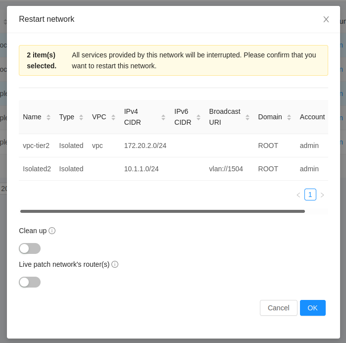 ### Description Shows cleanup when restarting a network in group action irrespective of the type of network Also throws an error notification when a group action fails ### Types of changes - [ ] Breaking change (fix or feature that would cause existing functionality to change) - [ ] New feature (non-breaking change which adds functionality) - [x] Bug fix (non-breaking change which fixes an issue) - [ ] Enhancement (improves an existing feature and functionality) - [ ] Cleanup (Code refactoring and cleanup, that may add test cases) #### Bug Severity - [ ] BLOCKER - [ ] Critical - [ ] Major - [x] Minor - [ ] Trivial ### Screenshots (if appropriate):  -- This is an automated message from the Apache Git Service. To respond to the message, please log on to GitHub and use the URL above to go to the specific comment. To unsubscribe, e-mail: [email protected] For queries about this service, please contact Infrastructure at: [email protected]