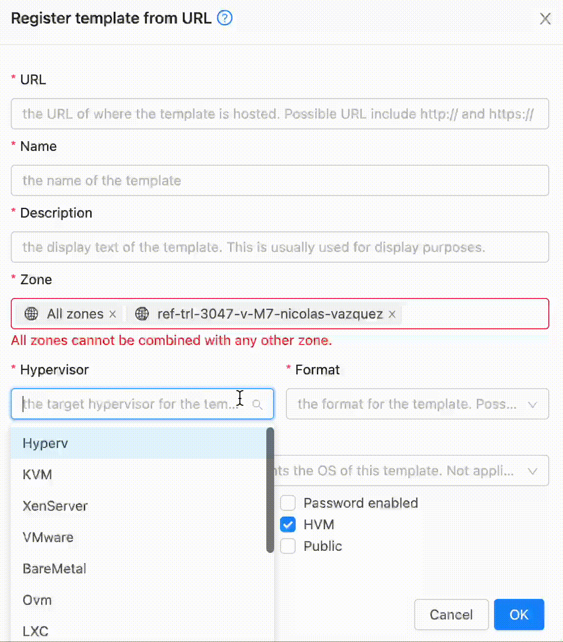 ### Description This PR fixes an error on the hypervisor menu when registering a template and the zone validation triggers  ### Types of changes - [ ] Breaking change (fix or feature that would cause existing functionality to change) - [ ] New feature (non-breaking change which adds functionality) - [x] Bug fix (non-breaking change which fixes an issue) - [ ] Enhancement (improves an existing feature and functionality) - [ ] Cleanup (Code refactoring and cleanup, that may add test cases) ### Feature/Enhancement Scale or Bug Severity #### Feature/Enhancement Scale - [ ] Major - [x] Minor #### Bug Severity - [ ] BLOCKER - [ ] Critical - [ ] Major - [x] Minor - [ ] Trivial ### Screenshots (if appropriate): ### How Has This Been Tested? <!-- Please describe in detail how you tested your changes. --> <!-- Include details of your testing environment, and the tests you ran to --> <!-- see how your change affects other areas of the code, etc. --> <!-- Please read the [CONTRIBUTING](https://github.com/apache/cloudstack/blob/main/CONTRIBUTING.md) document --> -- This is an automated message from the Apache Git Service. To respond to the message, please log on to GitHub and use the URL above to go to the specific comment. To unsubscribe, e-mail: [email protected] For queries about this service, please contact Infrastructure at: [email protected]