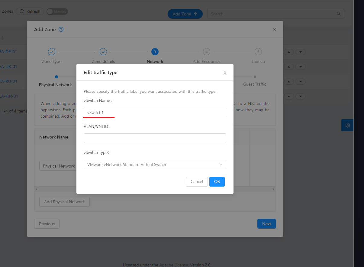 With this occasion I found a new bug, I also have upgraded setup to 4.16.1 from a previous version, where I already have the zone added. I wanted to try the same thing to see if I have the same issue, looks like here I have a different one. When I insert the vSwitch name and hit ok, the vSwitch name is not saved.  If I edit again, show empty ( I can continue like this and no label is saved for Management and Public)  It is saved only for "Guest"   If I add an additional Physical Network with traffic type "Guest" and try to continue I get this error, because I do not have labels to the above traffic types where are not saved. Looks like the error is showing only in case you add a secondary physical network, otherwise is ignored.  I also tested in Edge browser -- This is an automated message from the Apache Git Service. To respond to the message, please log on to GitHub and use the URL above to go to the specific comment. To unsubscribe, e-mail: [email protected] For queries about this service, please contact Infrastructure at: [email protected]