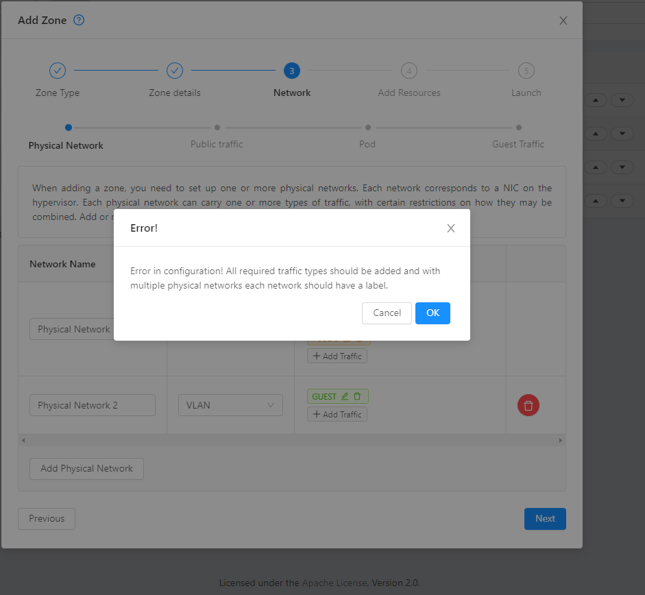 > @ccycv can you try again to see does it working? Now, I have labels added to all and I get this :  If I leave just 1 Physical network, I'm able to click next and finish the setup...   -- This is an automated message from the Apache Git Service. To respond to the message, please log on to GitHub and use the URL above to go to the specific comment. To unsubscribe, e-mail: [email protected] For queries about this service, please contact Infrastructure at: [email protected]