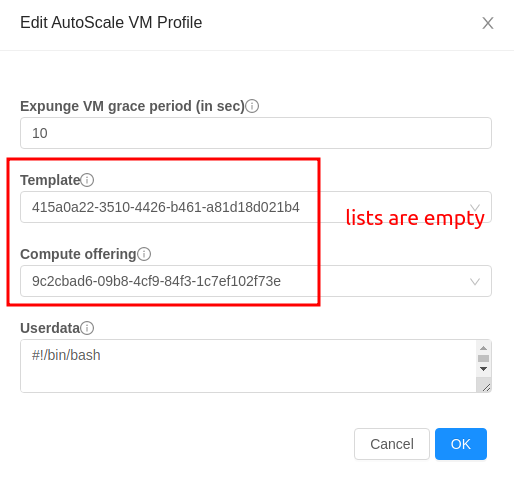 ### Description This PR fixes an UI issue that regular users cannot list offering and templates for autoscale vm group Steps to reproduce the issue - log in as regular user - create autoscale vm group - go to the vm group details, click "AutoScale VM Profile" tab.  - click 'Edit AutoScale VM Profile"  With this PR   <!--- Describe your changes in DETAIL - And how has behaviour functionally changed. --> <!-- For new features, provide link to FS, dev ML discussion etc. --> <!-- In case of bug fix, the expected and actual behaviours, steps to reproduce. --> <!-- When "Fixes: #<id>" is specified, the issue/PR will automatically be closed when this PR gets merged --> <!-- For addressing multiple issues/PRs, use multiple "Fixes: #<id>" --> <!-- Fixes: # --> <!--- ********************************************************************************* --> <!--- NOTE: AUTOMATATION USES THE DESCRIPTIONS TO SET LABELS AND PRODUCE DOCUMENTATION. --> <!--- PLEASE PUT AN 'X' in only **ONE** box --> <!--- ********************************************************************************* --> ### Types of changes - [ ] Breaking change (fix or feature that would cause existing functionality to change) - [ ] New feature (non-breaking change which adds functionality) - [x] Bug fix (non-breaking change which fixes an issue) - [ ] Enhancement (improves an existing feature and functionality) - [ ] Cleanup (Code refactoring and cleanup, that may add test cases) ### Feature/Enhancement Scale or Bug Severity #### Feature/Enhancement Scale - [ ] Major - [ ] Minor #### Bug Severity - [ ] BLOCKER - [ ] Critical - [x] Major - [ ] Minor - [ ] Trivial ### Screenshots (if appropriate): ### How Has This Been Tested? <!-- Please describe in detail how you tested your changes. --> <!-- Include details of your testing environment, and the tests you ran to --> <!-- see how your change affects other areas of the code, etc. --> <!-- Please read the [CONTRIBUTING](https://github.com/apache/cloudstack/blob/main/CONTRIBUTING.md) document --> -- This is an automated message from the Apache Git Service. To respond to the message, please log on to GitHub and use the URL above to go to the specific comment. To unsubscribe, e-mail: [email protected] For queries about this service, please contact Infrastructure at: [email protected]