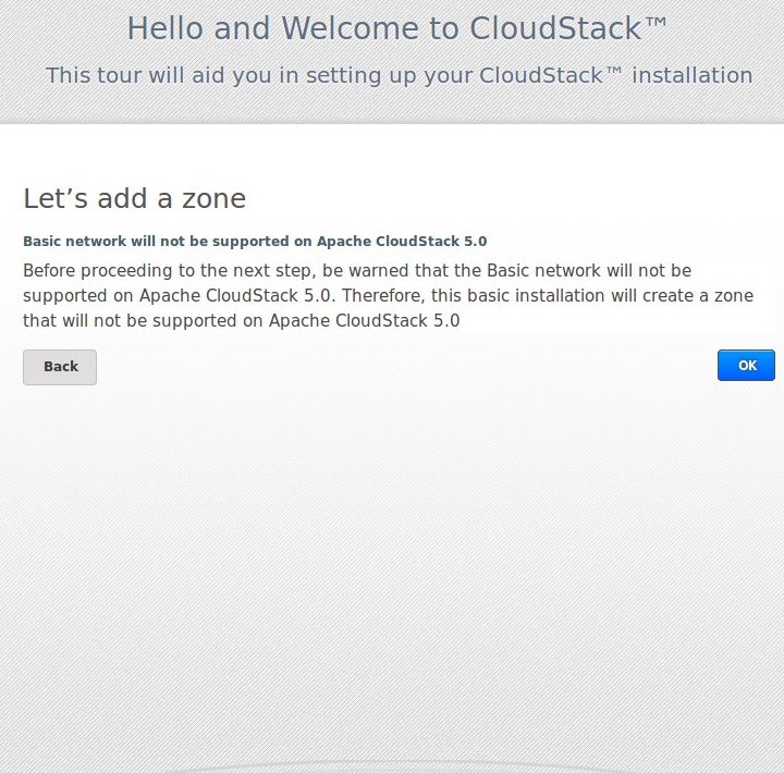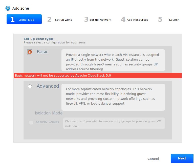 GabrielBrascher opened a new pull request #2748: Warn Basic network end of life URL: https://github.com/apache/cloudstack/pull/2748 ## Description <!--- Describe your changes in detail --> This PR addresses the discussion in the mailing list and at the PR #2720. The message warns that Basic network will no longer be supported on CloudStack 5.0. Note that this pull request was submitted against CloudStack `4.11.1.0-RC20180621T1552` The result of this PR can be seen in the following images when selecting the Basic network or Advanced network. From a new CloudStack environment the user might be interested in going through the basic installation.  In this case, he/she will be able to read a warn message and choose on proceeding or going back to the intro page.  When creating a new zone in the "usual" way, the user will also be warned about basic network end of life.  If the user click on the Advanced network checkbox, the warning message is hidden.  <!-- For new features, provide link to FS, dev ML discussion etc. --> <!-- In case of bug fix, the expected and actual behaviours, steps to reproduce. --> ## Types of changes <!--- What types of changes does your code introduce? Put an `x` in all the boxes that apply: --> - [ ] Breaking change (fix or feature that would cause existing functionality to change) - [ ] New feature (non-breaking change which adds functionality) - [ ] Bug fix (non-breaking change which fixes an issue) - [ ] Enhancement (improves an existing feature and functionality) - [ ] Cleanup (Code refactoring and cleanup, that may add test cases) ## GitHub Issue/PRs <!-- If this PR is to fix an issue or another PR on GH, uncomment the section and provide the id of issue/PR --> <!-- When "Fixes: #<id>" is specified, the issue/PR will automatically be closed when this PR gets merged --> <!-- For addressing multiple issues/PRs, use multiple "Fixes: #<id>" --> <!-- Fixes: # --> ## Screenshots (if appropriate): ## How Has This Been Tested? <!-- Please describe in detail how you tested your changes. --> <!-- Include details of your testing environment, and the tests you ran to --> <!-- see how your change affects other areas of the code, etc. --> ## Checklist: <!--- Go over all the following points, and put an `x` in all the boxes that apply. --> <!--- If you're unsure about any of these, don't hesitate to ask. We're here to help! --> - [x] I have read the [CONTRIBUTING](https://github.com/apache/cloudstack/blob/master/CONTRIBUTING.md) document. - [x] My code follows the code style of this project. - [ ] My change requires a change to the documentation. - [ ] I have updated the documentation accordingly. Testing - [ ] I have added tests to cover my changes. - [ ] All relevant new and existing integration tests have passed. - [ ] A full integration testsuite with all test that can run on my environment has passed.