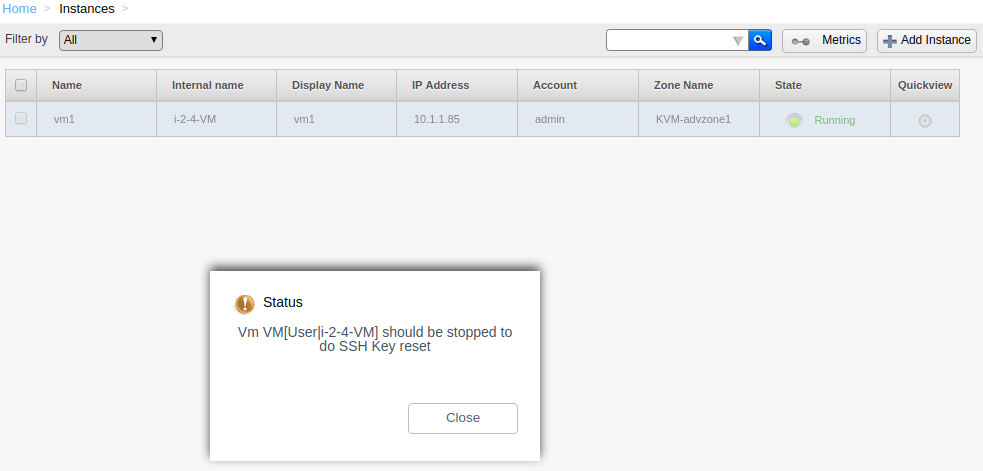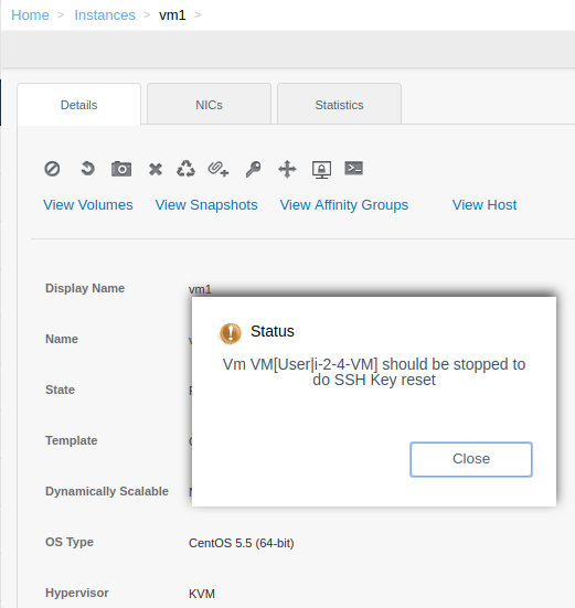 ernjvr opened a new pull request #2778: reset ssh key pair visibility URL: https://github.com/apache/cloudstack/pull/2778 ## Description <!--- Describe your changes in detail --> In the UI, on the Instances screen, the Quickview popup window and the Details window does not display the 'Reset SSH Key Pair' button for VMs in a running state. They only display when the VM is in a stopped state. This is inconsistent with the 'Reset Password' button behaviour, where they display in both VM states: running and stopped. This fixes the issue so that the 'Reset SSH Key Pair' button also displays in both VM states. <!-- For new features, provide link to FS, dev ML discussion etc. --> <!-- In case of bug fix, the expected and actual behaviours, steps to reproduce. --> Expected Behaviour: In the UI, on the Instances screen, the Quickview popup window and the Details window must display the 'Reset SSH Key Pair' button for VMs in both VM states: running and stopped. When a user clicks on the 'Reset SSH Key Pair' button and a VM is in a running state, it will display a message "Vm xxx should be stopped to do SSH Key reset". Actual Behaviour: In the UI, on the Instances screen, the Quickview popup window and the Details window does not display the 'Reset SSH Key Pair' button for VMs in a running state. They only display when the VM is in a stopped state. Steps to reproduce: 1) Quickview popup window: In the Cloudstack UI, in the left pane, click on Instances tab. Choose a VM that is in a running state and hover the mouse over the Quickview link so that the Quickview popup window is displayed. The 'Reset SSH Key Pair' button does not display among the other allowed actions. 2) Details window: In the Cloudstack UI, in the left pane, click on Instances tab. Choose a VM that is in a running state and click the mouse on the VM name to display the Details window. The 'Reset SSH Key Pair' button does not display among the other allowed actions. ## Types of changes <!--- What types of changes does your code introduce? Put an `x` in all the boxes that apply: --> - [ ] Breaking change (fix or feature that would cause existing functionality to change) - [ ] New feature (non-breaking change which adds functionality) - [x] Bug fix (non-breaking change which fixes an issue) - [ ] Enhancement (improves an existing feature and functionality) - [ ] Cleanup (Code refactoring and cleanup, that may add test cases) ## GitHub Issue/PRs <!-- If this PR is to fix an issue or another PR on GH, uncomment the section and provide the id of issue/PR --> <!-- When "Fixes: #<id>" is specified, the issue/PR will automatically be closed when this PR gets merged --> <!-- For addressing multiple issues/PRs, use multiple "Fixes: #<id>" --> <!-- Fixes: # --> ## Screenshots (if appropriate):     ## How Has This Been Tested? <!-- Please describe in detail how you tested your changes. --> <!-- Include details of your testing environment, and the tests you ran to --> <!-- see how your change affects other areas of the code, etc. --> Manually: 1) Quickview popup window: In the Cloudstack UI, in the left pane, click on Instances tab. Choose a VM that is in a running state and hover the mouse over the Quickview link so that the Quickview popup window is displayed. The 'Reset SSH Key Pair' button now displays among the other allowed actions. After clicking on the button it displays a message "Vm xxx should be stopped to do SSH Key reset". 2) Details window: In the Cloudstack UI, in the left pane, click on Instances tab. Choose a VM that is in a running state and click the mouse on the VM name to display the Details window. The 'Reset SSH Key Pair' button does now display among the other allowed actions. After clicking on the button it displays a message "Vm xxx should be stopped to do SSH Key reset". ## Checklist: <!--- Go over all the following points, and put an `x` in all the boxes that apply. --> <!--- If you're unsure about any of these, don't hesitate to ask. We're here to help! --> - [x] I have read the [CONTRIBUTING](https://github.com/apache/cloudstack/blob/master/CONTRIBUTING.md) document. - [x] My code follows the code style of this project. - [ ] My change requires a change to the documentation. - [ ] I have updated the documentation accordingly. Testing - [ ] I have added tests to cover my changes. - [ ] All relevant new and existing integration tests have passed. - [ ] A full integration testsuite with all test that can run on my environment has passed.