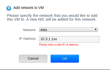 ernjvr opened a new pull request #2782: add ipaddress input field to 'Add network to VM' form URL: https://github.com/apache/cloudstack/pull/2782 ## Description <!--- Describe your changes in detail --> On the 'NICs' tab, when a user clicks the 'Add network to VM' button to add a network to a VM, the 'Add network to VM' popup screen does not have an IP Address input field to allow a user to define a specific IP Address for a NIC. A user can specify the IP address for the first NIC when creating a VM instance, but cannot do that for subsequent NICs when adding a network to a VM. <!-- For new features, provide link to FS, dev ML discussion etc. --> <!-- In case of bug fix, the expected and actual behaviours, steps to reproduce. --> To Reproduce: Go to the 'Instances' screen by clicking the 'Instances' tab on the lefthand side. On the 'Instances' screen click on a specific VM instance name. This will open the 'Details' tab for the specific VM instance. Click on the 'NICs' tab and then click on the 'Add network to VM' button to add a network to a VM. The 'Add network to VM' popup screen will display. Actual Behaviour: The 'Add network to VM' popup screen does not have an IP Address input field to allow a user to define a specific IP Address for a NIC. Expected behaviour: The 'Add network to VM' popup screen must have an IP Address input field to allow a user to define a specific IP Address for a NIC. Since the addNicToVirtualMachine API's ipaddress field is not required, the IP Address input field is also not a required field. The IP Address input field must be validated for a valid IPv4 formatted value if the user enters anything into the field. The valid user-specified IPv4 IP Address value must be allocated to the NIC if it is within the acceptable IP range for the chosen Network. ## Types of changes <!--- What types of changes does your code introduce? Put an `x` in all the boxes that apply: --> - [ ] Breaking change (fix or feature that would cause existing functionality to change) - [ ] New feature (non-breaking change which adds functionality) - [x] Bug fix (non-breaking change which fixes an issue) - [ ] Enhancement (improves an existing feature and functionality) - [ ] Cleanup (Code refactoring and cleanup, that may add test cases) ## GitHub Issue/PRs <!-- If this PR is to fix an issue or another PR on GH, uncomment the section and provide the id of issue/PR --> <!-- When "Fixes: #<id>" is specified, the issue/PR will automatically be closed when this PR gets merged --> <!-- For addressing multiple issues/PRs, use multiple "Fixes: #<id>" --> <!-- Fixes: # --> ## Screenshots (if appropriate):    ## How Has This Been Tested? Manually (See screenshots) <!-- Please describe in detail how you tested your changes. --> Go to the 'Instances' screen by clicking the 'Instances' tab on the lefthand side. On the 'Instances' screen click on a specific VM instance name. This will open the 'Details' tab for the specific VM instance. Click on the 'NICs' tab and then click on the 'Add network to VM' button to add a network to a VM. The 'Add network to VM' popup screen will display. The 'Add network to VM' popup screen now has an IP Address input field to allow a user to define a specific IP Address for a NIC. Since the addNicToVirtualMachine API's ipaddress field is not required, the IP Address input field is also not a required field. The IP Address input field is validated for a valid IPv4 formatted value if the user enters anything into the field. The valid user-specified IPv4 IP Address value is allocated to the NIC since it is within the acceptable IP range for the chosen Network. <!-- Include details of your testing environment, and the tests you ran to --> Environment: CloudStack version 4.11, KVM hypervisor. <!-- see how your change affects other areas of the code, etc. --> ## Checklist: <!--- Go over all the following points, and put an `x` in all the boxes that apply. --> <!--- If you're unsure about any of these, don't hesitate to ask. We're here to help! --> - [x] I have read the [CONTRIBUTING](https://github.com/apache/cloudstack/blob/master/CONTRIBUTING.md) document. - [x] My code follows the code style of this project. - [ ] My change requires a change to the documentation. - [ ] I have updated the documentation accordingly. Testing - [ ] I have added tests to cover my changes. - [ ] All relevant new and existing integration tests have passed. - [ ] A full integration testsuite with all test that can run on my environment has passed.