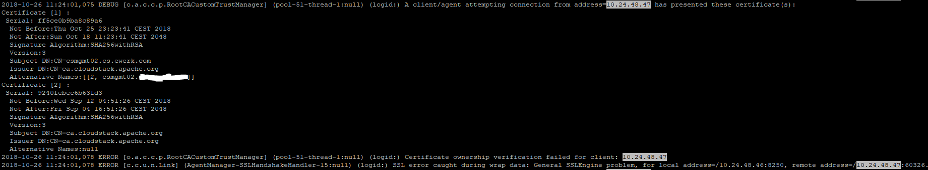 DennisKonrad opened a new issue #2930: HA for Management Server - roundrobin: Certificate ownership URL: https://github.com/apache/cloudstack/issues/2930 <!-- Verify first that your issue/request is not already reported on GitHub. Also test if the latest release and master branch are affected too. Always add information AFTER of these HTML comments, but no need to delete the comments. --> ##### ISSUE TYPE <!-- Pick one below and delete the rest --> * Bug Report ##### COMPONENT NAME <!-- Categorize the issue, e.g. API, VR, VPN, UI, etc. --> Management Server HA ##### CLOUDSTACK VERSION <!-- New line separated list of affected versions, commit ID for issues on master branch. --> master ##### CONFIGURATION <!-- Information about the configuration if relevant, e.g. basic network, advanced networking, etc. N/A otherwise --> indirect.agent.lb.algorithm = roundrobin host = 10.24.48.46,10.24.48.47 ##### SUMMARY <!-- Explain the problem/feature briefly --> When trying to use the CS Management in roundrobin loadbalanced mode we get errors creating a VPC for example. If we use `indirect.agent.lb.algorithm = static` it works like a charm for both managementservers. The log states it has something todo with the certificates issued:  It's not really clear what the error message itself is trying to say or how I can debug this further. ##### STEPS TO REPRODUCE as stated above ##### EXPECTED RESULTS <!-- What did you expect to happen when running the steps above? --> ##### ACTUAL RESULTS <!-- What actually happened? --> <!-- Paste verbatim command output between quotes below -->