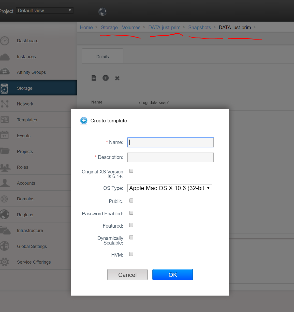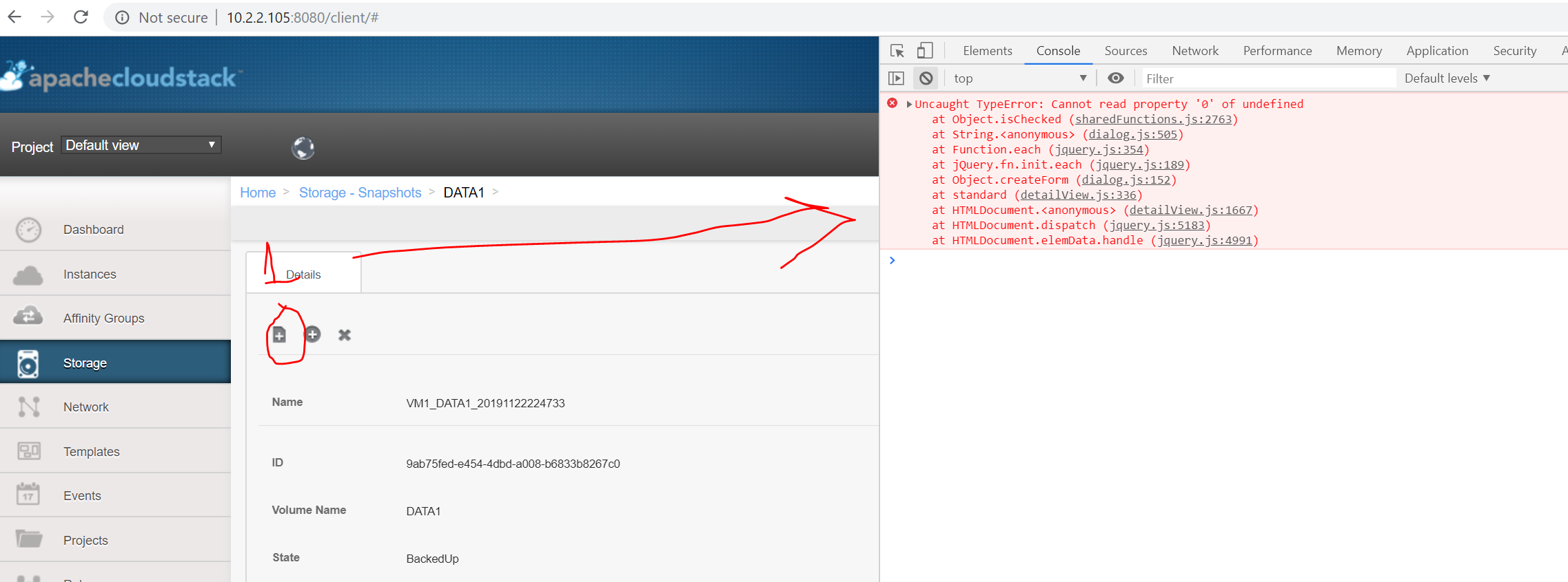 DaanHoogland opened a new issue #3716: creating template from snapshot does not work from snapshot list URL: https://github.com/apache/cloudstack/issues/3716 <!-- Verify first that your issue/request is not already reported on GitHub. Also test if the latest release and master branch are affected too. Always add information AFTER of these HTML comments, but no need to delete the comments. --> If you go to STORAGE (main section menu on the left), then select VOLUMES from the dropdown list, select a particular volume, than see snapshots, then select a snaphost - then clicking on button WILL work fine and popup window is show as follows:  But if you go to STORAGE (main section menu on the left), then select SNAPSHOTS from the dropdown list and find one and click the button - then an exception happens in the javascript code:  ##### ISSUE TYPE <!-- Pick one below and delete the rest --> * Bug Report ##### COMPONENT NAME <!-- Categorize the issue, e.g. API, VR, VPN, UI, etc. --> ~~~ UI ~~~ ##### CLOUDSTACK VERSION <!-- New line separated list of affected versions, commit ID for issues on master branch. --> ~~~ 4.13 ~~~ ##### CONFIGURATION <!-- Information about the configuration if relevant, e.g. basic network, advanced networking, etc. N/A otherwise --> ##### OS / ENVIRONMENT <!-- Information about the environment if relevant, N/A otherwise --> ##### SUMMARY <!-- Explain the problem/feature briefly --> ##### STEPS TO REPRODUCE <!-- For bugs, show exactly how to reproduce the problem, using a minimal test-case. Use Screenshots if accurate. For new features, show how the feature would be used. --> <!-- Paste example playbooks or commands between quotes below --> ~~~ ~~~ <!-- You can also paste gist.github.com links for larger files --> ##### EXPECTED RESULTS <!-- What did you expect to happen when running the steps above? --> ~~~ ~~~ ##### ACTUAL RESULTS <!-- What actually happened? --> <!-- Paste verbatim command output between quotes below --> ~~~ ~~~