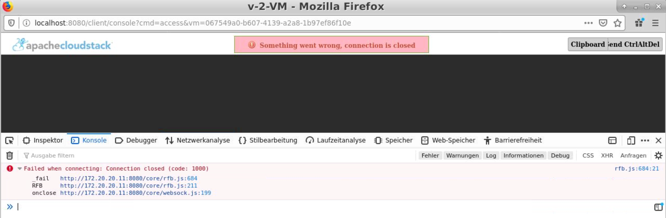 DennisKonrad edited a comment on issue #3296: [master] noVNC Console Integration URL: https://github.com/apache/cloudstack/pull/3296#issuecomment-576696540 @ustcweizhou I'm tying to get this running in a test environment. Can you give me some indications on what maybe wrong. I'm using [master with this PR merged ](https://github.com/DennisKonrad/cloudstack/tree/novnc). It seems to me after or during the upgrade to a websocket connection something fails with the novnc console. (After reading the older comments again: No certificate uploaded in this environment and guest.domain.suffix is `test.kvm` ) <details> <summary>Screenshots</summary>   The old cs console works fine when I set `novnc.console.default` to `false` and reboot the console system vm.  </details>