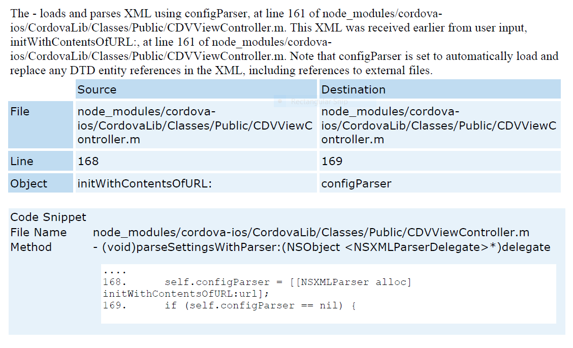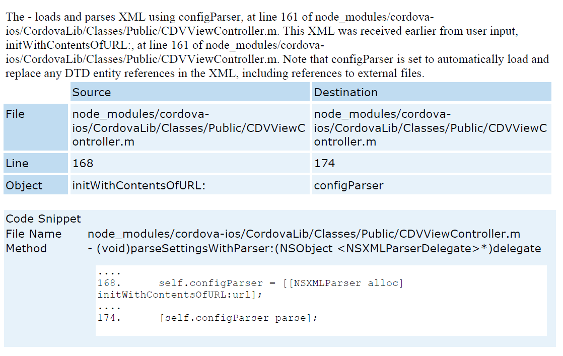 trangnt-bkhn opened a new issue #697: XML External Entity URL: https://github.com/apache/cordova-ios/issues/697 # Bug Report ## Problem We have scanned the code and finded the issue at line 168, 173, 174 . Can you check more in photos. ### What does actually happen?    ## Information <!-- Include all relevant information that might help understand and reproduce the problem --> ### Command or Code <!-- What command or code is needed to reproduce the problem? --> ### Environment, Platform, Device <!-- In what environment, on what platform or on which device are you experiencing the issue? --> ### Version information <!-- What are relevant versions you are using? For example: Cordova: Cordova CLI, Cordova Platforms, Cordova Plugins Other Frameworks: Ionic Framework and CLI version Operating System, Android Studio, Xcode etc. --> ## Checklist <!-- Please check the boxes by putting an x in the [ ] like so: [x] --> - [ ] I searched for existing GitHub issues - [ ] I updated all Cordova tooling to most recent version - [ ] I included all the necessary information above