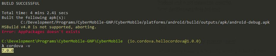 KevinKeyssx commented on issue #277: VS Professional 2017 v15.7: MSBuild v4.0 is not supported, aborting. URL: https://github.com/apache/cordova-windows/issues/277#issuecomment-579248992 Hello, I have the same problem, but I do not have VS 2017 and 2019 therefore I cannot configure the MSBUILDDIR environment variable, I only have Android Studios and the error is: MSBuild v4.0 is not supported, aborting. Error: AppPackages does not exist My version of cordova is: 7.0.0 Any idea how to solve the problem I have?