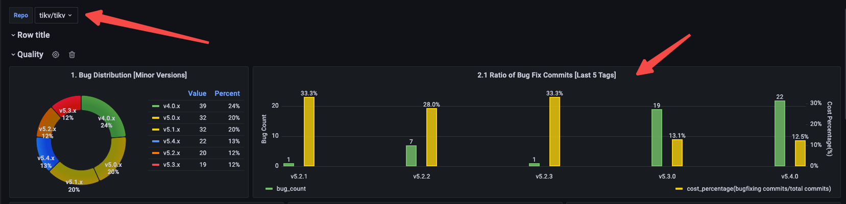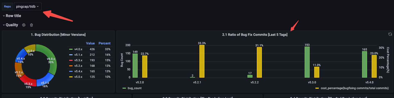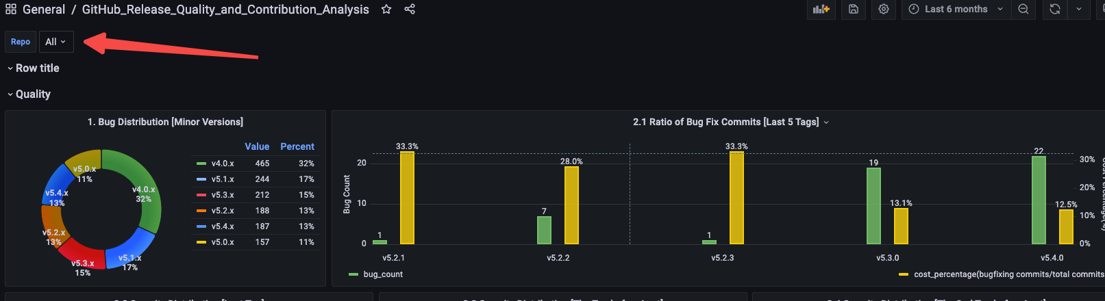 ## Description 1. The grafana GithubReleaseQualityAndContributionAnalysis plan to add some severity distribution so that users understand the severity distribution of bug in different tag. 2. when user use dashboard and select all repo, the function does not work.    -- This is an automated message from the Apache Git Service. To respond to the message, please log on to GitHub and use the URL above to go to the specific comment. To unsubscribe, e-mail: [email protected] For queries about this service, please contact Infrastructure at: [email protected]