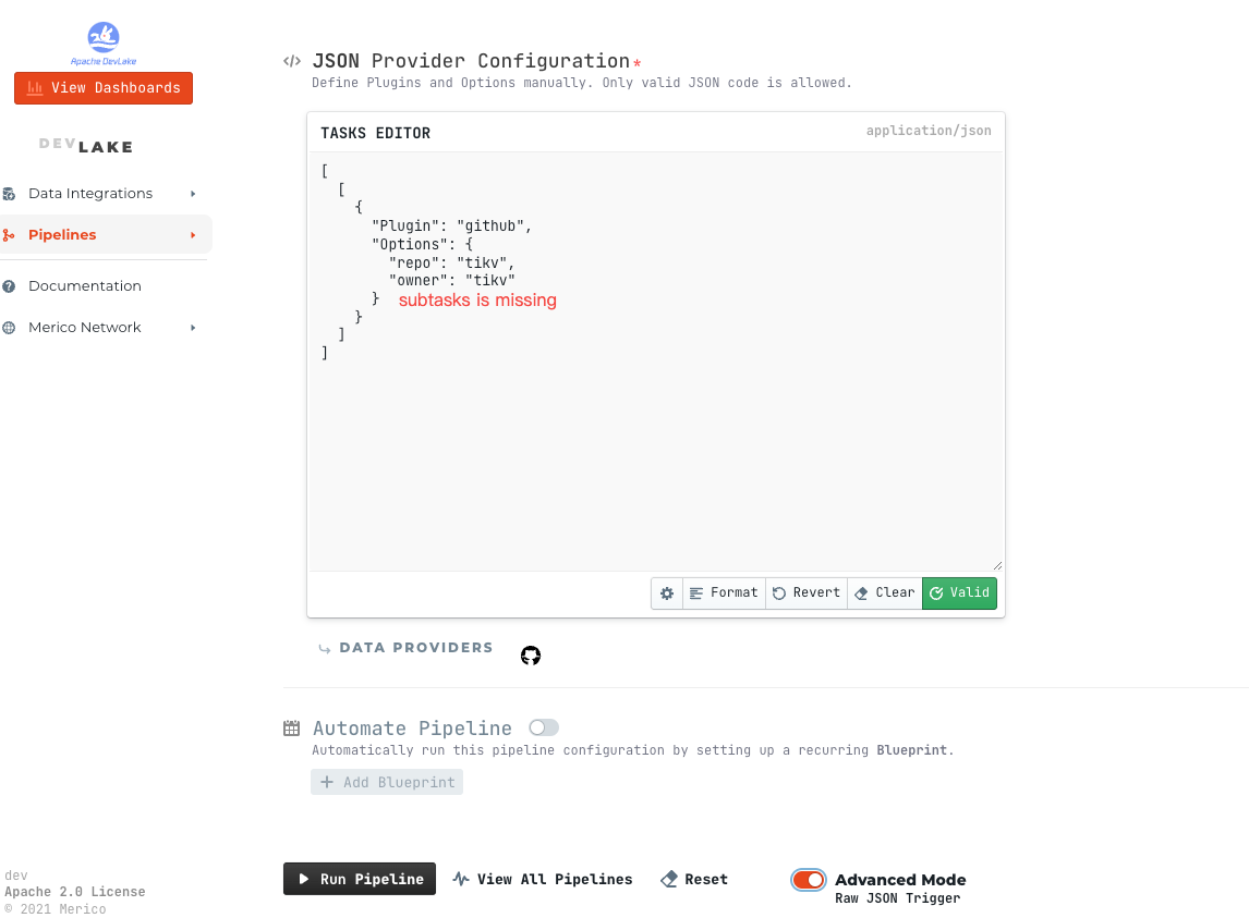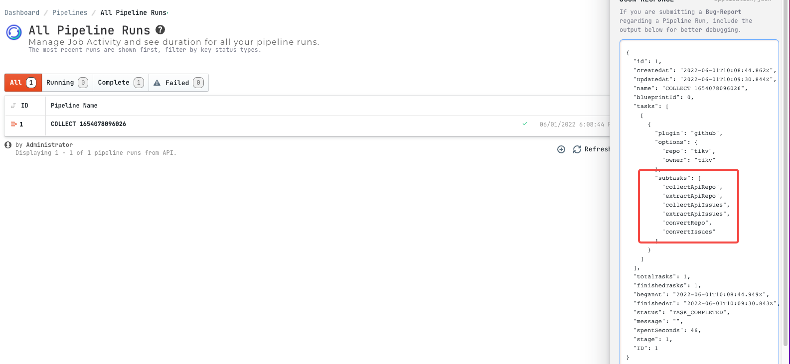 @e2corporation Solved by https://github.com/apache/incubator-devlake/pull/2057, but configure-ui needs to be adapted. the subtasks is missing. 1. Here you can see the execution parameters ![Uploading image.png…]()  2. into advanced mode, you can see:  -- This is an automated message from the Apache Git Service. To respond to the message, please log on to GitHub and use the URL above to go to the specific comment. To unsubscribe, e-mail: [email protected] For queries about this service, please contact Infrastructure at: [email protected]