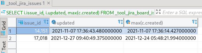 I tried another technique, to compare issue.updated with max(changelog.created):  This almost did the job, except:  That is because of comment would cause `issue.updated` get updated, but it wouldn't generate a `changelog` -- This is an automated message from the Apache Git Service. To respond to the message, please log on to GitHub and use the URL above to go to the specific comment. To unsubscribe, e-mail: [email protected] For queries about this service, please contact Infrastructure at: [email protected]
