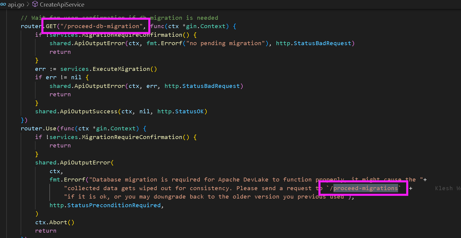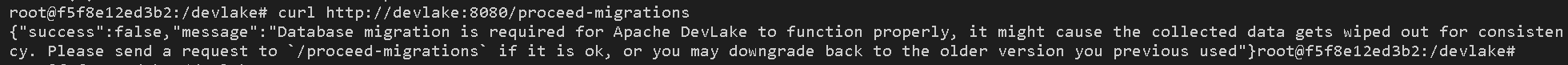 ### Search before asking - [X] I had searched in the [issues](https://github.com/apache/incubator-devlake/issues?q=is%3Aissue) and found no similar issues. ### What happened   the right url was /proceed-db-migration. but the error info show the wrong url /proceed-migrations. ### What you expected to happen At least show the right url. It is better to give user an shell file for help user process db migration easily. ### How to reproduce 1.Install an old version devlake, like version v0.11.0 2.Collect some data into old version. 3.Update the devlake. 4.See the information about api request. ### Anything else _No response_ ### Version main ### Are you willing to submit PR? - [X] Yes I am willing to submit a PR! ### Code of Conduct - [X] I agree to follow this project's [Code of Conduct](https://www.apache.org/foundation/policies/conduct) -- This is an automated message from the Apache Git Service. To respond to the message, please log on to GitHub and use the URL above to go to the specific comment. To unsubscribe, e-mail: [email protected] For queries about this service, please contact Infrastructure at: [email protected]