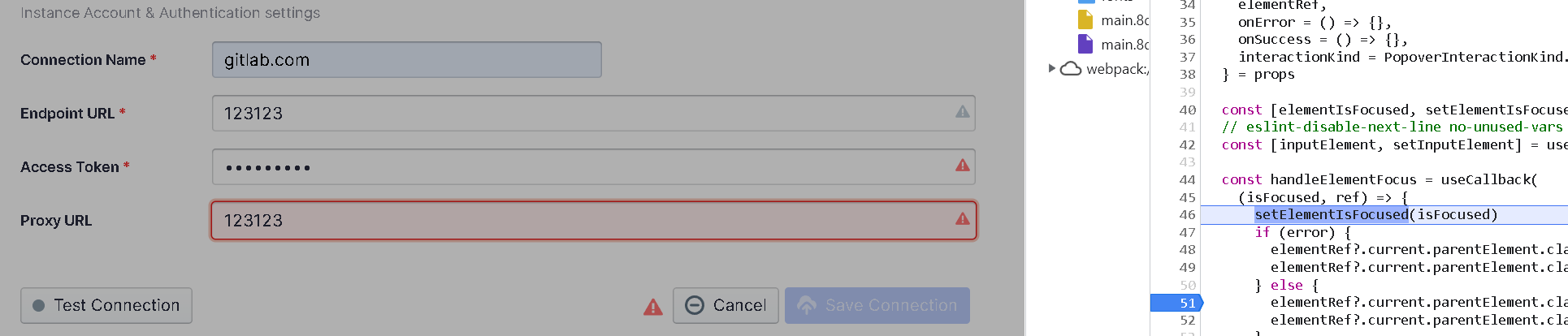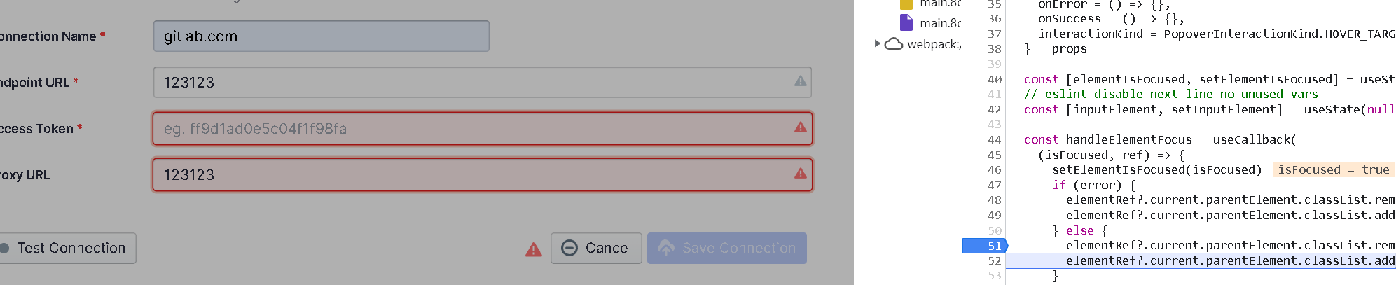 ### Search before asking - [X] I had searched in the [issues](https://github.com/apache/incubator-devlake/issues?q=is%3Aissue) and found no similar issues. ### What happened When we try to setting the token for gitlab . we can not input anything And if we try to set it by chrome console, it will be clean after focus on it. As follow gif  try to debug it and handle the focus. At the second times to run the handleElementFocus, before setElementIsFocused, the value still have.  But after this code,We lost input value.  And also it skip the line of breakpoint. It is happend even focus on other input. ### What you expected to happen We can set the token by input. ### How to reproduce 1.Add gitlab connection 2.try to set token. ### Anything else _No response_ ### Version main ### Are you willing to submit PR? - [ ] Yes I am willing to submit a PR! ### Code of Conduct - [X] I agree to follow this project's [Code of Conduct](https://www.apache.org/foundation/policies/conduct) -- This is an automated message from the Apache Git Service. To respond to the message, please log on to GitHub and use the URL above to go to the specific comment. To unsubscribe, e-mail: [email protected] For queries about this service, please contact Infrastructure at: [email protected]