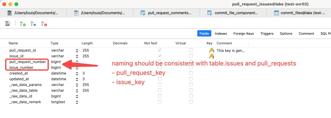 ### Search before asking - [X] I had searched in the [issues](https://github.com/apache/incubator-devlake/issues?q=is%3Aissue) and found no similar issues. ### What happened  ### What you expected to happen - field `pull_request_number` in the table pull_request_issues should be `pull_request_key` - field `issue_number` in the table pull_request_issues should be `issue_key` to be consistent with their counterparts in table.issues and table.pull_requests ### How to reproduce 1. Run DevLake and connect to MySQL 2. Check out table pull_request_issues ### Anything else _No response_ ### Version main ### Are you willing to submit PR? - [ ] Yes I am willing to submit a PR! ### Code of Conduct - [X] I agree to follow this project's [Code of Conduct](https://www.apache.org/foundation/policies/conduct) -- This is an automated message from the Apache Git Service. To respond to the message, please log on to GitHub and use the URL above to go to the specific comment. To unsubscribe, e-mail: [email protected] For queries about this service, please contact Infrastructure at: [email protected]