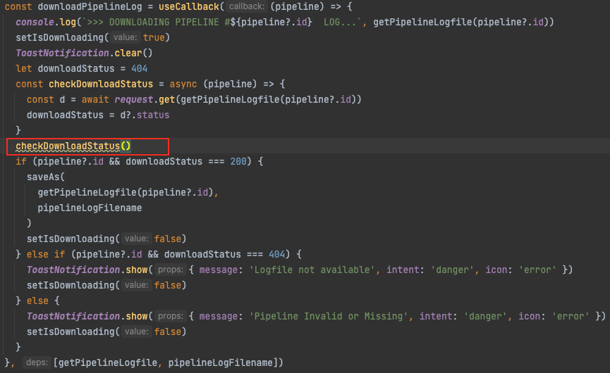 > I think it should be the problem of the following line of code, the 'pipeline' parameter is not passed in. `checkDownloadStatus()` > > https://github.com/apache/incubator-devlake/blob/b81b98d4f039c44ed3dd70b8e76a51a0b06432b2/config-ui/src/pages/blueprints/blueprint-detail.jsx#L228 > >  > > I changed it to `checkDownloadStatus(pipeline)` and it works. > >  Thanks for the reply and for noticing this -- yes this is the main issue `pipeline` var was not injected. This logic is also being slightly re-worked and the variable will be passed as expected. -- This is an automated message from the Apache Git Service. To respond to the message, please log on to GitHub and use the URL above to go to the specific comment. To unsubscribe, e-mail: [email protected] For queries about this service, please contact Infrastructure at: [email protected]