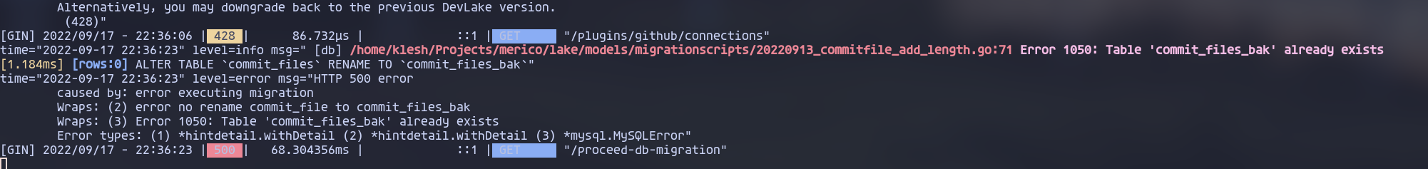 ### Search before asking - [X] I had searched in the [issues](https://github.com/apache/incubator-devlake/issues?q=is%3Aissue) and found no similar issues. ### What happened `20220913_commitfile_add_length.go` depends on gitlab api `dal` instance. the script would fail if gitlab plugin is missing. however, the script won't work anymore even if I bring gitlab plugin back  ### What you expected to happen migration script should be working when gitlab became available. ### How to reproduce 1. make sure the script is in pending status 2. fire up devlake with `PLUGIN=github make dev` 3. call /procced-db-migraion, fail 4. restart devlake with `make dev` 5. call /process-db-migration 6. see error ### Anything else _No response_ ### Version main ### Are you willing to submit PR? - [ ] Yes I am willing to submit a PR! ### Code of Conduct - [X] I agree to follow this project's [Code of Conduct](https://www.apache.org/foundation/policies/conduct) -- This is an automated message from the Apache Git Service. To respond to the message, please log on to GitHub and use the URL above to go to the specific comment. To unsubscribe, e-mail: [email protected] For queries about this service, please contact Infrastructure at: [email protected]