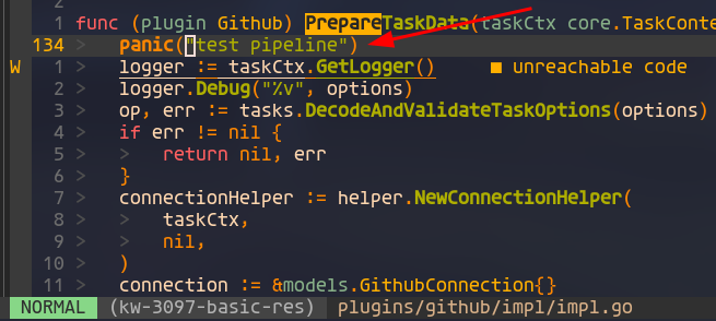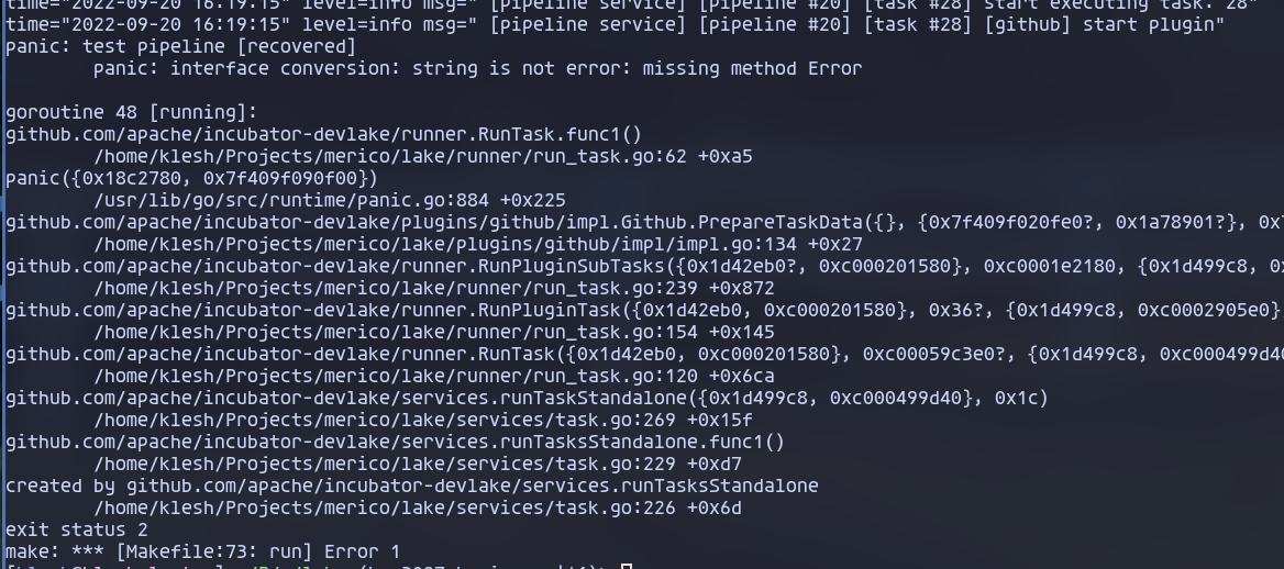 ### Search before asking - [X] I had searched in the [issues](https://github.com/apache/incubator-devlake/issues?q=is%3Aissue) and found no similar issues. ### What happened 1. modify any plugin to trigger a panic  2. trigger a pipeline, and the whole app crashes  ### What you expected to happen The backend should keep running even if the pipeline panicked ### How to reproduce Described in What happened ### Anything else _No response_ ### Version v0.12.0 ### Are you willing to submit PR? - [X] Yes I am willing to submit a PR! ### Code of Conduct - [X] I agree to follow this project's [Code of Conduct](https://www.apache.org/foundation/policies/conduct) -- This is an automated message from the Apache Git Service. To respond to the message, please log on to GitHub and use the URL above to go to the specific comment. To unsubscribe, e-mail: [email protected] For queries about this service, please contact Infrastructure at: [email protected]