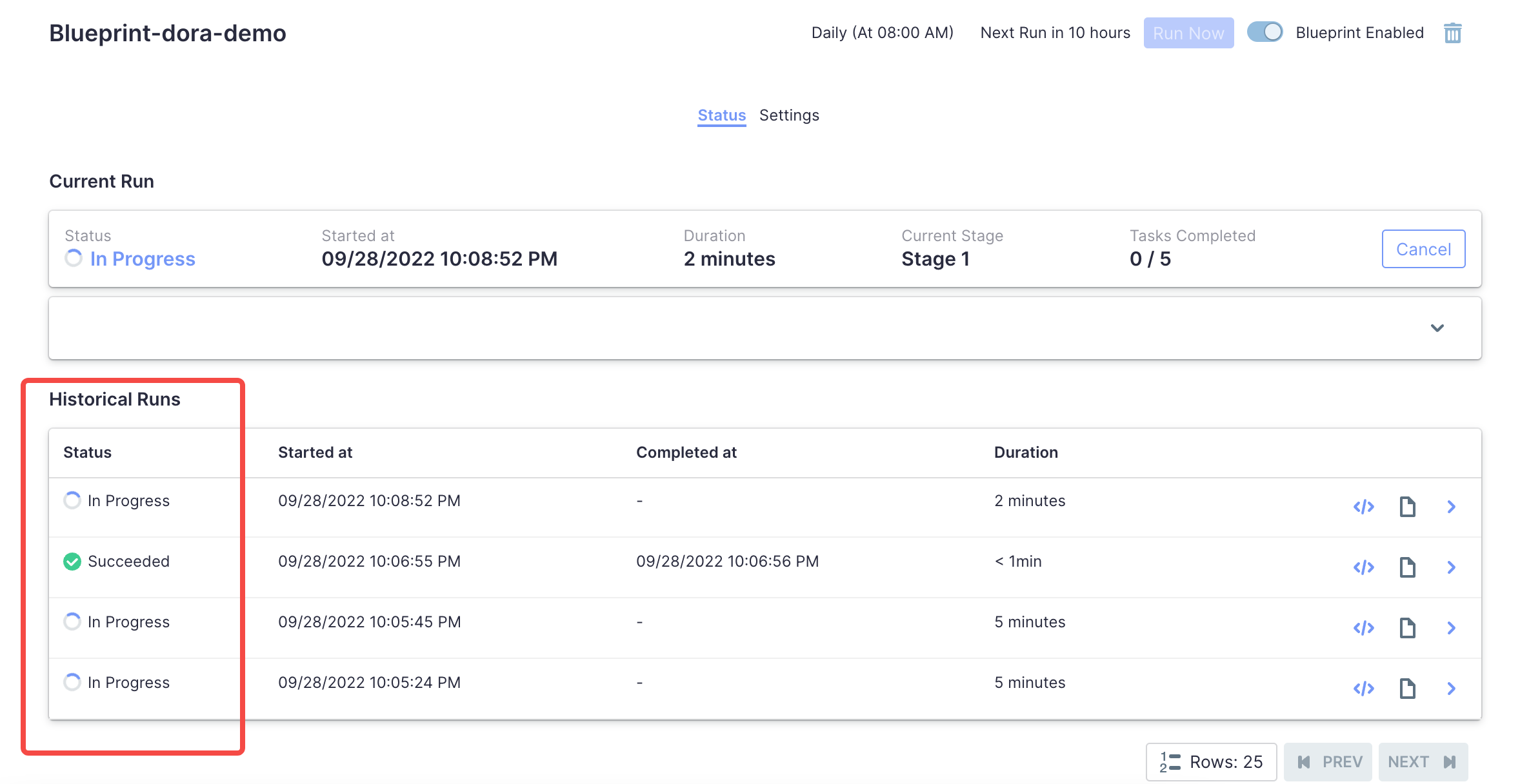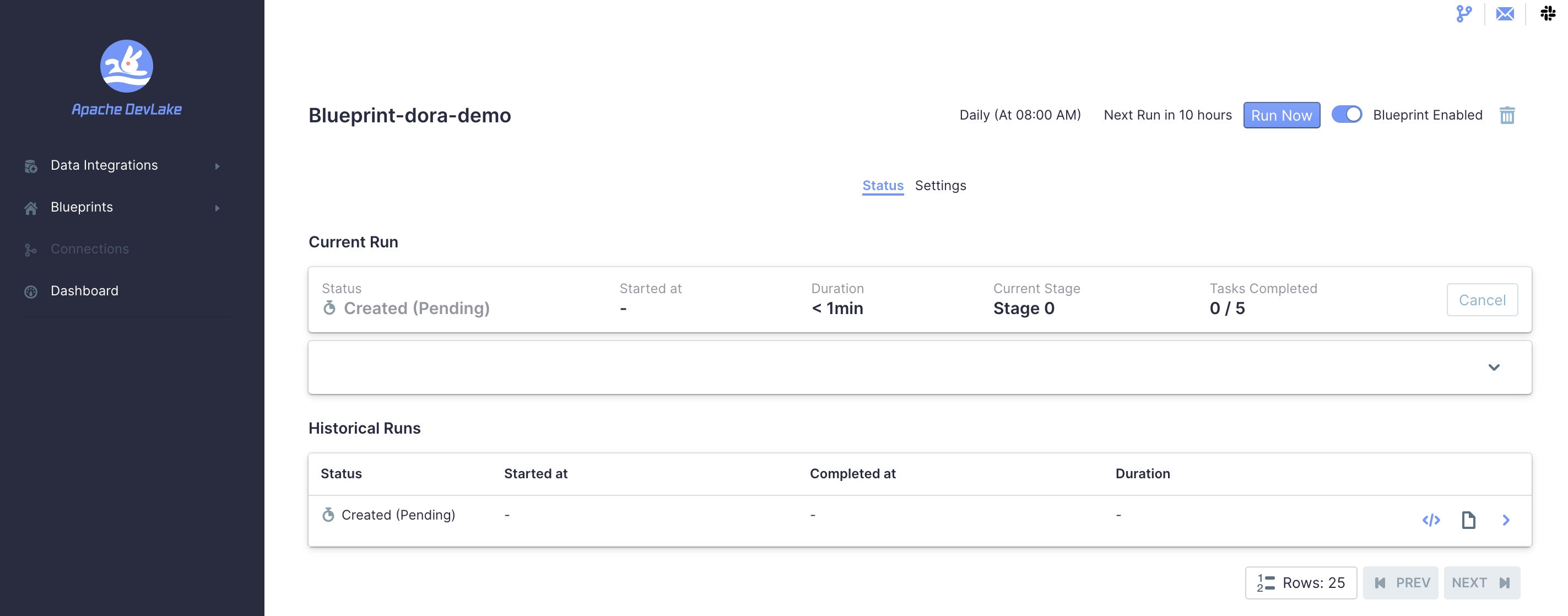 ### Search before asking - [X] I had searched in the [issues](https://github.com/apache/incubator-devlake/issues?q=is%3Aissue) and found no similar issues. ### What happened After I finished configuring a blueprint and clicked the `save and run now`, the page looked like this:  I thought `save and run now` was broken, so I clicked 3 times again. Then I refreshed the page, and it showed a current run and 3 historical runs:  I'm not sure if these 4 pipelines executed concurrently will slow down the collection speed, if so, this bug can be very problematic. ### What you expected to happen This page auto-refresh and show the current run. ### How to reproduce Visit here or your own config-ui and create a blueprint: https://ui-my-svr02.demo.devlake.io/ ### Anything else _No response_ ### Version main ### Are you willing to submit PR? - [ ] Yes I am willing to submit a PR! ### Code of Conduct - [X] I agree to follow this project's [Code of Conduct](https://www.apache.org/foundation/policies/conduct) -- This is an automated message from the Apache Git Service. To respond to the message, please log on to GitHub and use the URL above to go to the specific comment. To unsubscribe, e-mail: [email protected] For queries about this service, please contact Infrastructure at: [email protected]
