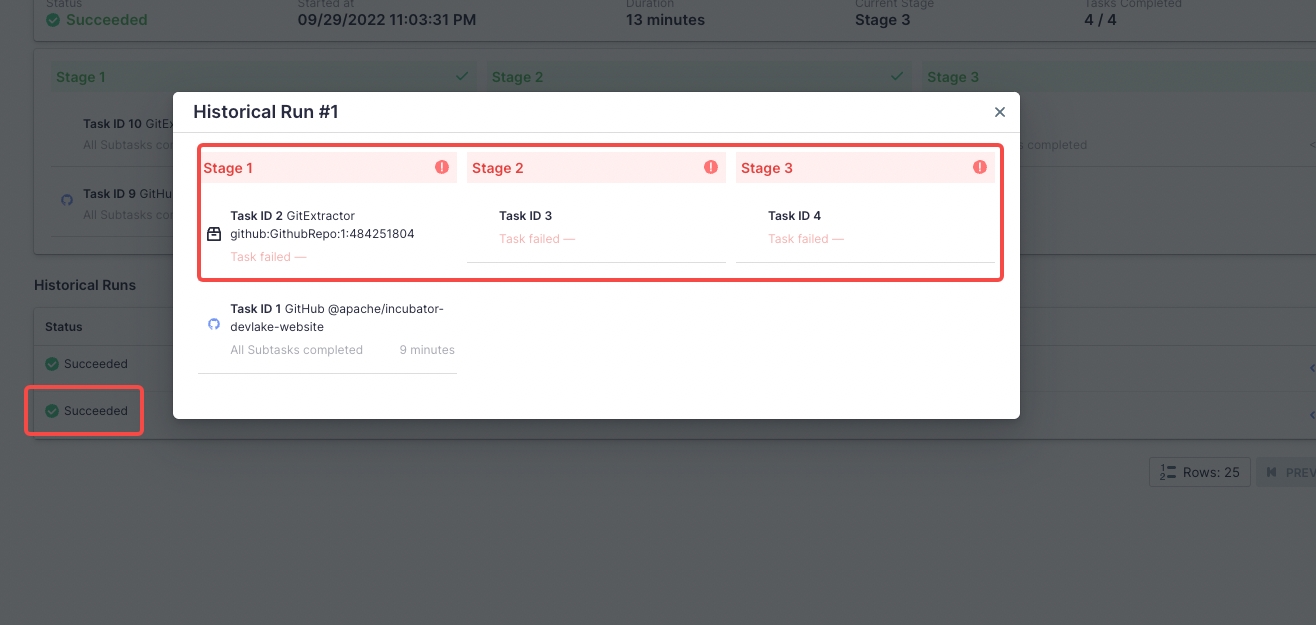 ### Search before asking - [X] I had searched in the [issues](https://github.com/apache/incubator-devlake/issues?q=is%3Aissue) and found no similar issues. ### What happened some stages fail to execute, and the pipeline returns success.  ### What you expected to happen After all the stages run successfully, the pipeline returns. ### How to reproduce run github plugin by configu-ui normal model, repo: apache/incubator-devlake-website ### Anything else _No response_ ### Version main ### Are you willing to submit PR? - [ ] Yes I am willing to submit a PR! ### Code of Conduct - [X] I agree to follow this project's [Code of Conduct](https://www.apache.org/foundation/policies/conduct) -- This is an automated message from the Apache Git Service. To respond to the message, please log on to GitHub and use the URL above to go to the specific comment. To unsubscribe, e-mail: [email protected] For queries about this service, please contact Infrastructure at: [email protected]