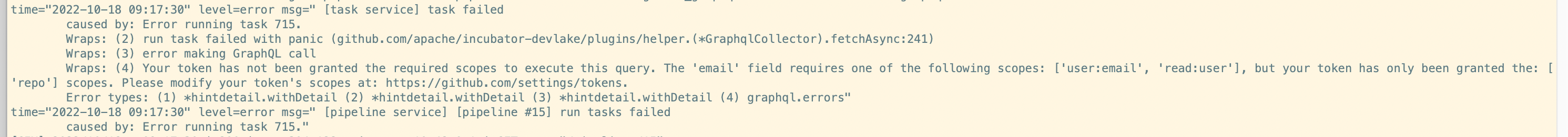 ### Search before asking - [X] I had searched in the [issues](https://github.com/apache/incubator-devlake/issues?q=is%3Aissue) and found no similar issues. ### What happened   Wraps: (4) Your token has not been granted the required scopes to execute this query. The 'email' field requires one of the following scopes: ['user:email', 'read:user'], but your token has only been granted the: ['repo'] scopes. Please modify your token's scopes at: https://github.com/settings/tokens. The most important log not show in UI. ### What you expected to happen more readable error message should be display in all HTTP APIs ### How to reproduce 1. create a blueprint with github_graphql 2. run someway to got an error 3. look at config-UI ### Anything else _No response_ ### Version main ### Are you willing to submit PR? - [ ] Yes I am willing to submit a PR! ### Code of Conduct - [X] I agree to follow this project's [Code of Conduct](https://www.apache.org/foundation/policies/conduct) -- This is an automated message from the Apache Git Service. To respond to the message, please log on to GitHub and use the URL above to go to the specific comment. To unsubscribe, e-mail: [email protected] For queries about this service, please contact Infrastructure at: [email protected]
