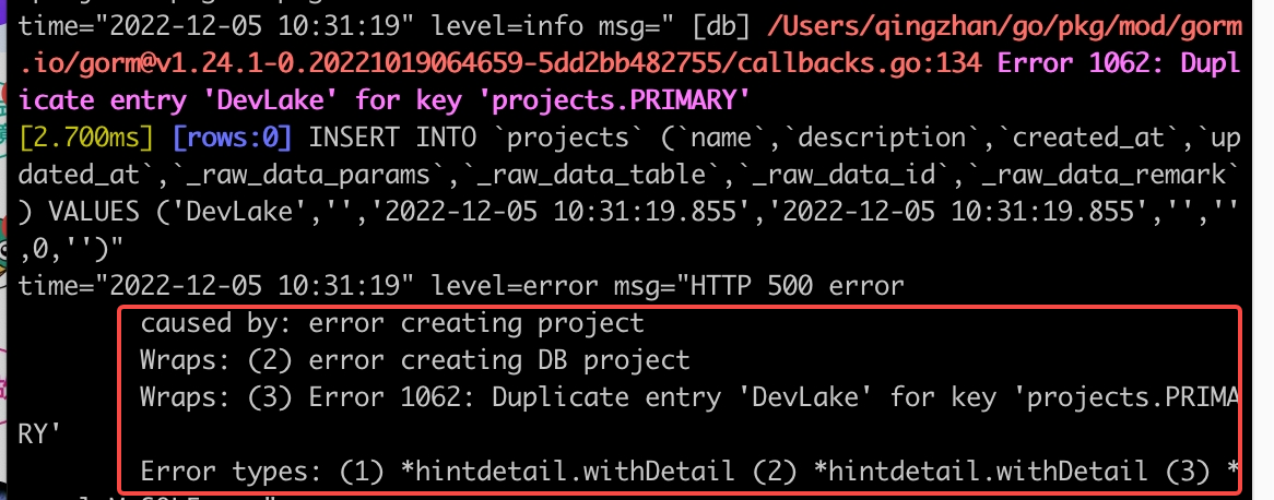 ### Search before asking - [X] I had searched in the [issues](https://github.com/apache/incubator-devlake/issues?q=is%3Aissue) and found no similar issues. ### What happened  We can see all detail of the error in the logs.  But only one part of it is in the HTTP response.    That made us lose the necessary detail. As we see, the ApiOutputError uses the Message() to return the error for HTTP  But in DefaultLogger:   it uses Error() to format the data. ### What do you expect to happen Show all detailed errors for the HTTP response. ### How to reproduce Post a project whose projectName already exists. See the HTTP response and logs. ### Anything else _No response_ ### Version main ### Are you willing to submit PR? - [X] Yes I am willing to submit a PR! ### Code of Conduct - [X] I agree to follow this project's [Code of Conduct](https://www.apache.org/foundation/policies/conduct) -- This is an automated message from the Apache Git Service. To respond to the message, please log on to GitHub and use the URL above to go to the specific comment. To unsubscribe, e-mail: [email protected] For queries about this service, please contact Infrastructure at: [email protected]