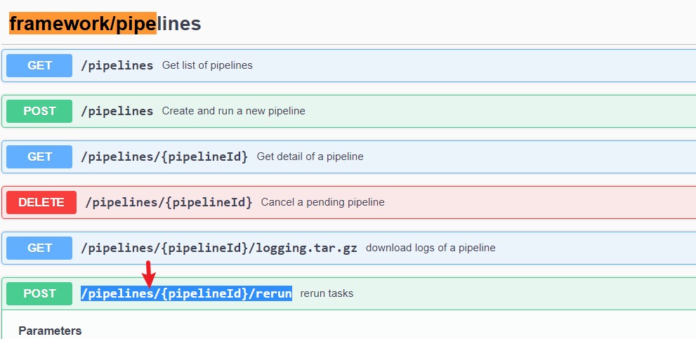 `/pipeline/{pipelineId}/rerun` should be `/pipelines/{pipelineId}/rerun`