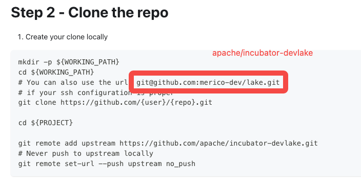 You can update the example in this doc: https://devlake.apache.org/community/make-contribution/development-workflow/. Then add the link to the README. For example: change the repo name as below  -- This is an automated message from the Apache Git Service. To respond to the message, please log on to GitHub and use the URL above to go to the specific comment. To unsubscribe, e-mail: [email protected] For queries about this service, please contact Infrastructure at: [email protected]