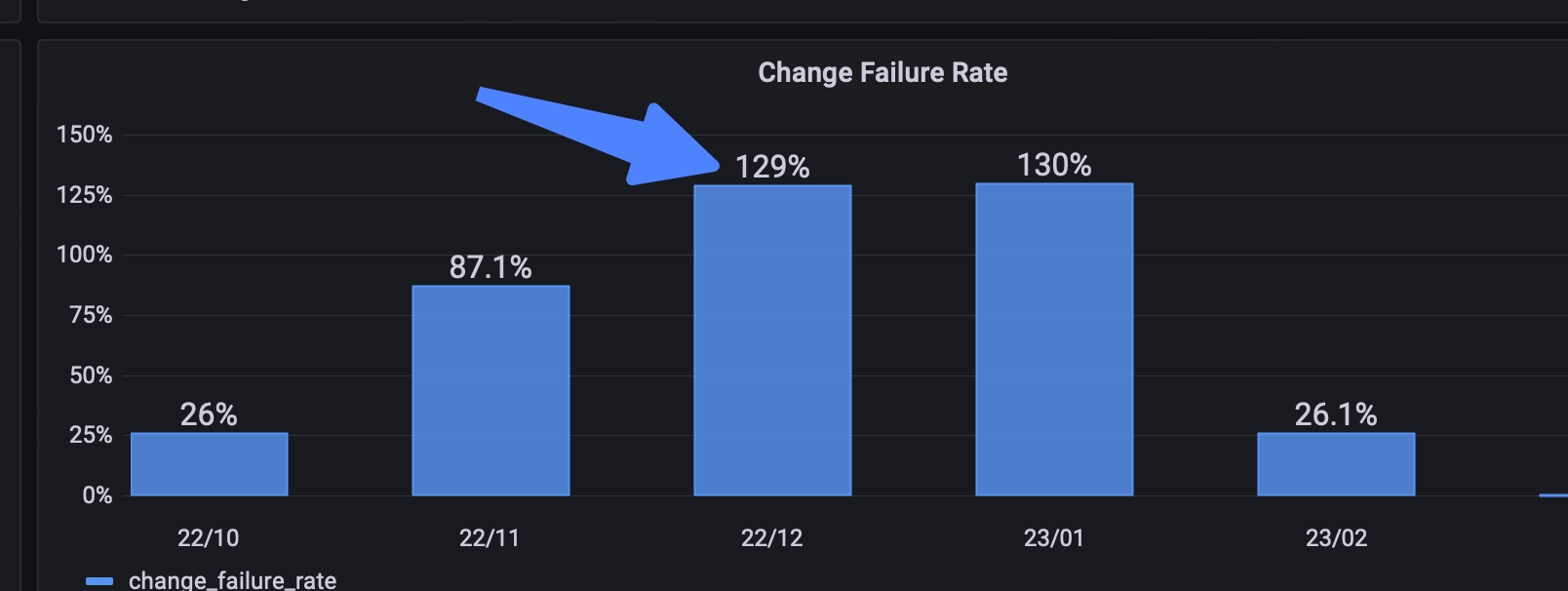 ### Search before asking - [X] I had searched in the [issues](https://github.com/apache/incubator-devlake/issues?q=is%3Aissue) and found no similar issues. ### What happened The `Change Failure Rate` can be higher than 100%, which is confusing.  After I checked the doc, the current algorithm is defined as below. <img width="1116" alt="img_v2_9d2bd9c1-a0b0-4cac-b487-fe0b64e7b11g" src="https://user-images.githubusercontent.com/14050754/223609741-da249528-6bad-425a-ac58-703d10bf6423.png"> ### What do you expect to happen We should define CFR as: The number of changes(deployments) that causes failure(incidents) / The number of changes (deployments) ### How to reproduce Go to DORA dashboard and see the SQL of CFR ### Anything else _No response_ ### Version main ### Are you willing to submit PR? - [X] Yes I am willing to submit a PR! ### Code of Conduct - [X] I agree to follow this project's [Code of Conduct](https://www.apache.org/foundation/policies/conduct) -- This is an automated message from the Apache Git Service. To respond to the message, please log on to GitHub and use the URL above to go to the specific comment. To unsubscribe, e-mail: [email protected] For queries about this service, please contact Infrastructure at: [email protected]