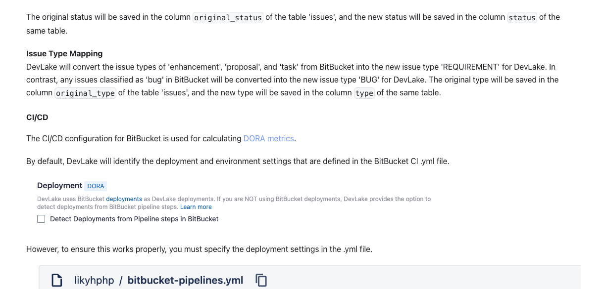 ### ⚠️ Pre Checklist > Please complete _ALL_ items in this checklist, and remove before submitting - [ ] I have `npm run build` and `npm run serve` locally before submitting this PR - [ ] I have read through the [Contributing](https://devlake.apache.org/community/) Documentation # Summary 1. add BitBucket issue type mapping part 2. update the CICD description 3. update screenshots for better display ### Does this close any open issues? N/A ### Screenshots   ### Other Information Any other information that is important to this PR. -- This is an automated message from the Apache Git Service. To respond to the message, please log on to GitHub and use the URL above to go to the specific comment. To unsubscribe, e-mail: [email protected] For queries about this service, please contact Infrastructure at: [email protected]