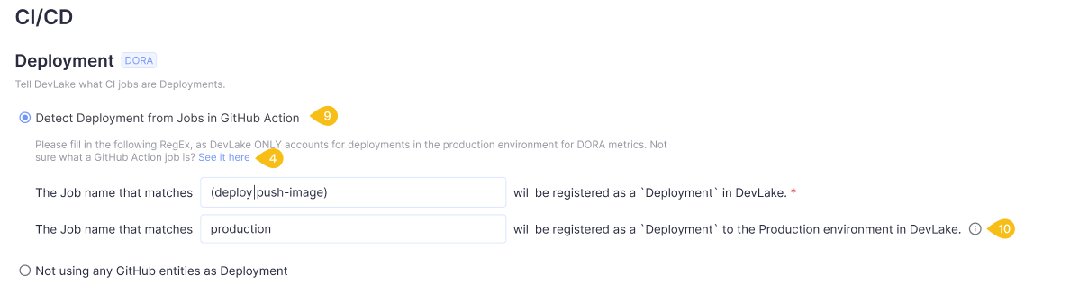 Hey @GSoul-hub , where did you get the deployment data from? You have to configure the transformation rule to extract production values from your CI job titles via RegEx. This is a screenshot of the GitHub transformation page, I hope it makes sense.  -- This is an automated message from the Apache Git Service. To respond to the message, please log on to GitHub and use the URL above to go to the specific comment. To unsubscribe, e-mail: [email protected] For queries about this service, please contact Infrastructure at: [email protected]