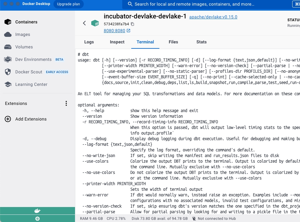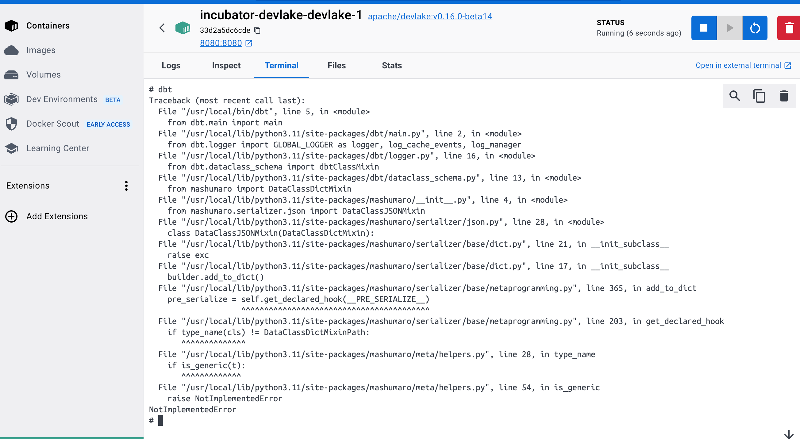 ### Search before asking - [X] I had searched in the [issues](https://github.com/apache/incubator-devlake/issues?q=is%3Aissue) and found no similar issues. ### What happened When I enter the devlake container to execute the `dbt` command through the v0.16.0-beta14 version, an error will be reported. I think it is caused by the python version.  ### What do you expect to happen Executing `dbt` command should have such a result:  ### How to reproduce 1. installed devlake by https://devlake.apache.org/docs/next/GettingStarted/DockerComposeSetup (v0.16.0-beta14) 2. Enter the devlake container and execute `dbt` ### Anything else _No response_ ### Version v0.16.0 ### Are you willing to submit PR? - [ ] Yes I am willing to submit a PR! ### Code of Conduct - [X] I agree to follow this project's [Code of Conduct](https://www.apache.org/foundation/policies/conduct) -- This is an automated message from the Apache Git Service. To respond to the message, please log on to GitHub and use the URL above to go to the specific comment. To unsubscribe, e-mail: [email protected] For queries about this service, please contact Infrastructure at: [email protected]