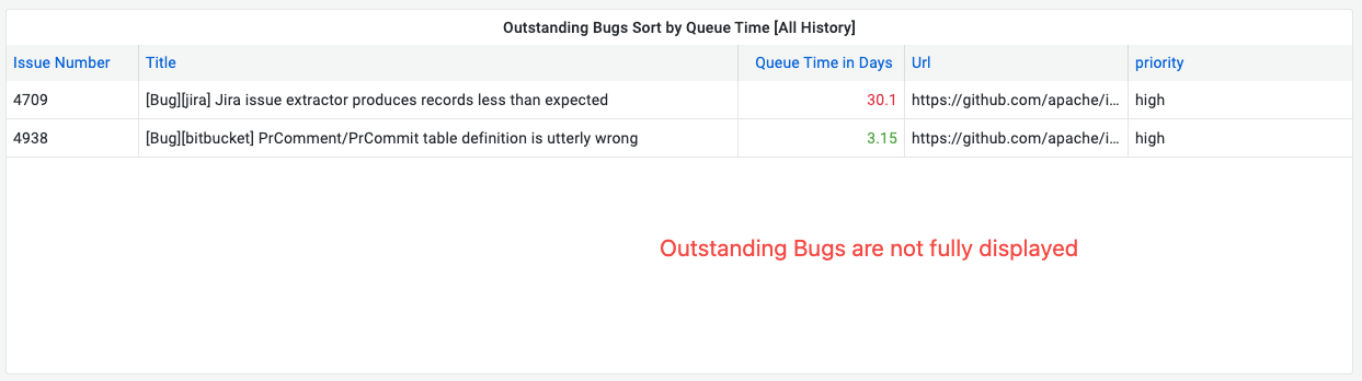 ### Search before asking - [X] I had searched in the [issues](https://github.com/apache/incubator-devlake/issues?q=is%3Aissue) and found no similar issues. ### What happened  ### What do you expect to happen All outstanding bugs can be displayed. ### How to reproduce Go to the 'weekly bug retro' dashboard ### Anything else _No response_ ### Version main ### Are you willing to submit PR? - [X] Yes I am willing to submit a PR! ### Code of Conduct - [X] I agree to follow this project's [Code of Conduct](https://www.apache.org/foundation/policies/conduct) -- This is an automated message from the Apache Git Service. To respond to the message, please log on to GitHub and use the URL above to go to the specific comment. To unsubscribe, e-mail: [email protected] For queries about this service, please contact Infrastructure at: [email protected]