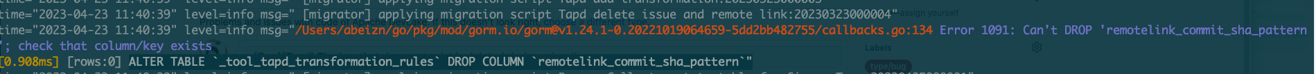 ### Search before asking - [X] I had searched in the [issues](https://github.com/apache/incubator-devlake/issues?q=is%3Aissue) and found no similar issues. ### What happened ALTER TABLE `_tool_tapd_transformation_rules` DROP COLUMN `remotelink_commit_sha_pattern`" Can't DROP 'remotelink_commit_sha_pattern'; check that column/key exists  ### What do you expect to happen migration is right ### How to reproduce make dev at main branch ### Anything else _No response_ ### Version main ### Are you willing to submit PR? - [X] Yes I am willing to submit a PR! ### Code of Conduct - [X] I agree to follow this project's [Code of Conduct](https://www.apache.org/foundation/policies/conduct) -- This is an automated message from the Apache Git Service. To respond to the message, please log on to GitHub and use the URL above to go to the specific comment. To unsubscribe, e-mail: [email protected] For queries about this service, please contact Infrastructure at: [email protected]