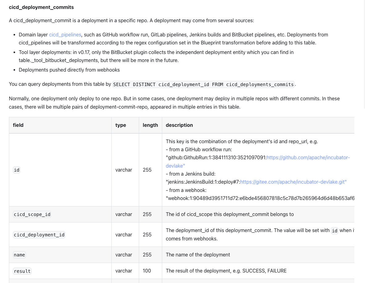 ### ⚠️ Pre Checklist > Please complete _ALL_ items in this checklist, and remove before submitting - [ ] I have `npm run build` and `npm run serve` locally before submitting this PR - [ ] I have read through the [Contributing](https://devlake.apache.org/community/) Documentation # Summary 1. add cicd_deployment_commits 2. update other cicd tables 3. update schema diagram ### Does this close any open issues? Closes #505 ### Screenshots  -- This is an automated message from the Apache Git Service. To respond to the message, please log on to GitHub and use the URL above to go to the specific comment. To unsubscribe, e-mail: [email protected] For queries about this service, please contact Infrastructure at: [email protected]